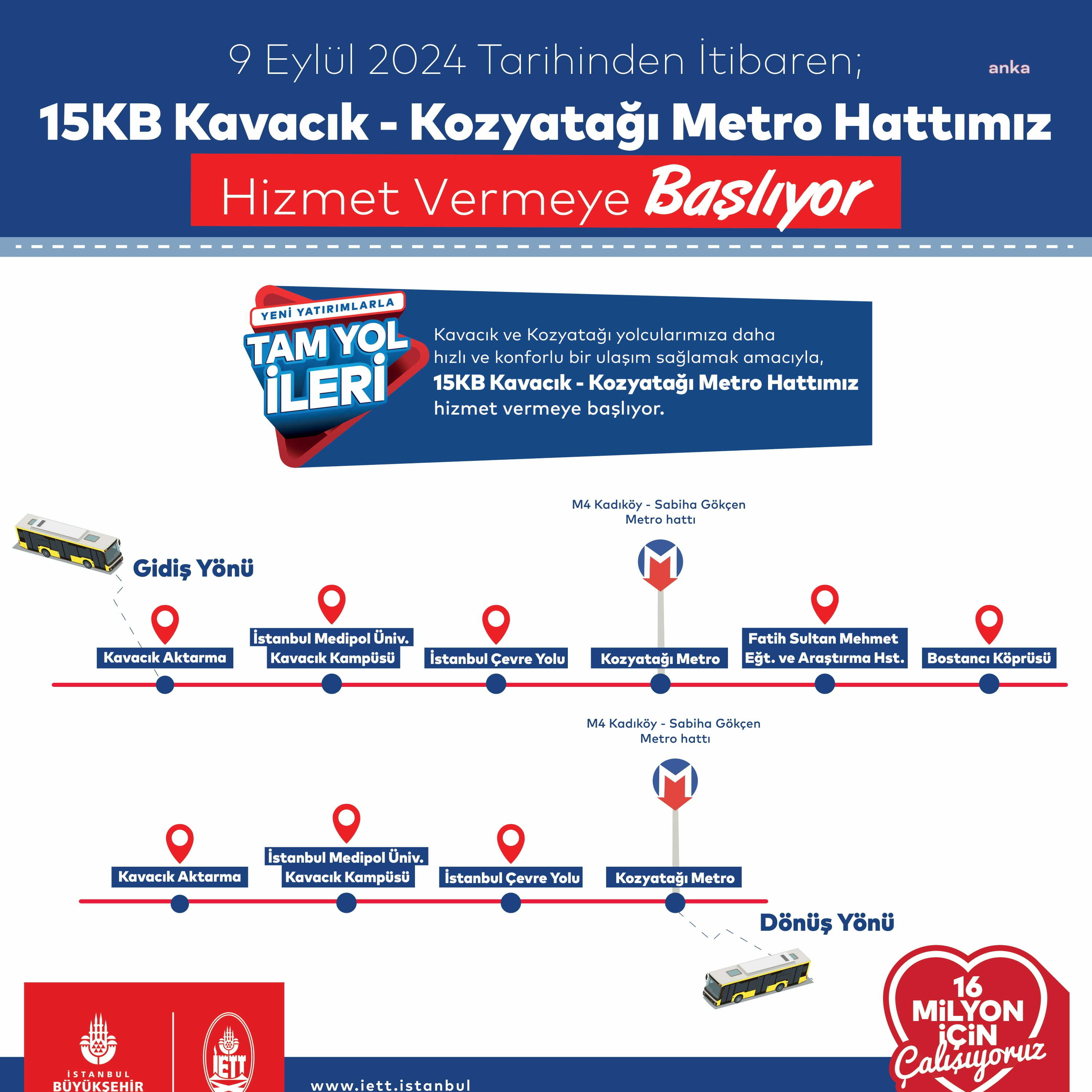 İstanbul Büyükşehir Belediyesi İETT Genel Müdürlüğü’nün yoğun talep üzerine yeniden başlattığı otobüs hattı 15KB, Kavacık aktarma noktasında başlayarak İstanbul Medipol Üniversitesi Kavacık Kampüsü, İstanbul Çevre Yolu ve Kozyatağı Metro İstasyonu gibi duraklardan geçecek. Seferler hafta içi saat 07.00’de başlayarak akşam saat 21.20'ye kadar devam edecek. 500T'nin yolcu yoğunluğunu azaltarak İstanbul'un ulaşım ağını genişletmeyi hedefleyen 15KB, 9 Eylül 2024 tarihinde yeniden ilk seferine çıkacak.