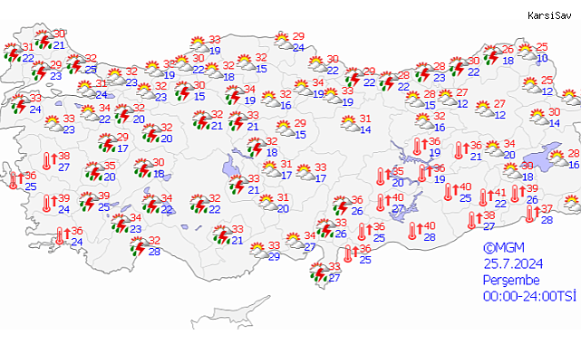 (ANKARA) - Meteoroloji'nin son yaptığı değerlendirmelere göre, bugün İç ve Doğu Akdeniz, İç Anadolu’nun batısı, İç Ege, Edirne, Kırklareli ve Karaman çevreleri ile Hatay kıyılarında yerel kuvvetli yağış bekleniyor.Meteoroloji Genel Müdürlüğü'nün (MGM) verilerine göre, bugün Trakya, İç Ege, İç ve Doğu Akdeniz, İç Anadolu’nun batısı, Doğu Karadeniz'in iç ve yüksek kesimleri, Çanakkale, Bilecik, Bolu ve Ordu çevreleri ile Van'ın kuzey ve doğu kesimlerinin yerel sağanak ve gök gürültülü sağanak yağışlı geçeceği tahmin ediliyor. MGM, hava sıcaklıklarının iç ve kuzeydoğu kesimlerde 2-4 derece azalacağını bildirdi. Meteoroloji, yağışların yerel kuvvetli olması beklendiğinden yaşanabilecek olumsuzluklara karşı vatandaşları uyardı. Sıcaklıklar, 4 ilde 40 derecenin üzerine çıkacak. Batman'da 41, Adıyaman, Şanlıurfa ve Diyarbakır'da 40 derece olacak. Hava sıcaklıkları, Ankara'da en yüksek 32, en düşük 21; İstanbul'da en yüksek 32, en düşük 25; İzmir'de en yüksek 36, en düşük 25 derece olacak.