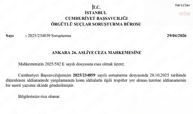 (İSTANBUL) - İstanbul 1. Ağır Ceza Mahkemesi'nde görülen "Aziz İhsan Aktaş suç örgütü" davasına ait iddianamenin bir örneği, Ankara 26. Asliye Ceza Mahkemesi'nin talebi üzerine "Kurultay Ceza Davası" dosyasına gönderildi.İstanbul 1. Ağır Ceza Mahkemesi'nde görülen Aziz İhsan Aktaş suç örgütü davasına ilişkin iddianamenin bir örneği, Ankara 26. Asliye Ceza Mahkemesi'ne iletildi.Yargı kaynaklarından edinilen bilgiye göre, Ankara 26. Asliye Ceza Mahkemesi, yürüttüğü "Kurultay Ceza Davası" kapsamında İstanbul'daki davaya ait iddianameyi talep etti.Talep üzerine Aziz İhsan Aktaş suç örgütü davası iddianamesinin bir örneği Ankara'ya gönderilerek, "Kurultay Ceza Davası" dosyasına eklendi.