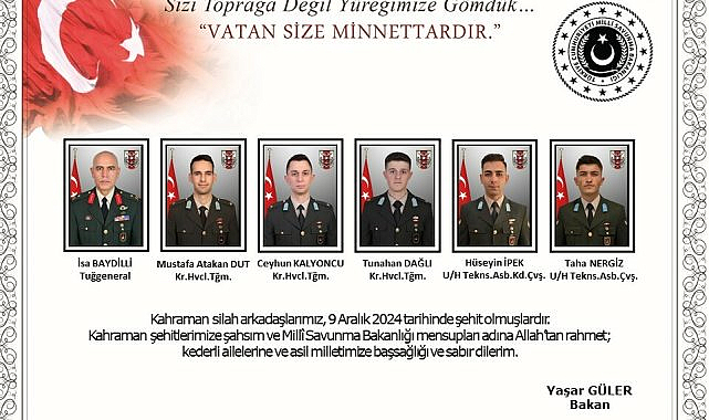 Milli Savunma Bakanı (MSB) Yaşar Güler, Isparta'da eğitim uçuşu yapan bir adet UH-1 tipi helikopterin, kaza kırıma uğraması sonucunda şehit olan Tuğgeneral İsa Baydilli, Kr.HvcI. Tğm. Mustafa Atakan Dut, Kr.HvcI.Tğm Tunahan Dağlı, Kr.HvcI.Tğm. Ceyhun Kalyoncu, U/H Tekn.Asb.Kd.Çvş. Hüseyin İpek ve U/H Tekn.Asb.Kd.Çvş. Taha Nergiz'e Allah'tan rahmet ve ailelerine başsağlı diledi. MSB'nin X hesabından paylaşılan Güler'in mesajında şu ifadeler kullanıldı: "Kahramam silah arkadaşlarımız, 9 Aralık 2024 tarihinde şehit olmuşlardır. Kahraman şehitlerimize şahsım ve Milli Savunma Bakanlığı mensupları adına Allah'tan rahmet; kederli ailelerine ve asil milletimize başsağlığı ve sabır dilerim."