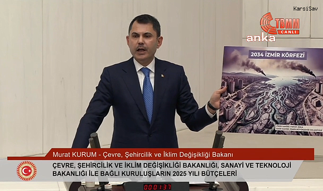 TBMM Genel Kurulu'nda konuşan Çevre, Şehircilik ve İklim Değişikliği Bakanı Murat Kurum, yapay zeka uygulamasına göre İzmir körfezinin 10 yıl sonraki halinin yer aldığı fotoğrafı göstererek, "Sayın Özgür Özel 'belediye başkan adaylarımızı yapay zeka ile belirliyoruz' demişti. Biz de yapay zekanın belirlediği adayların yönettiği şehirleri sorduk ve Dünya'nın en geniş uygulamalarından birini kullandık. Uygulamaya İzmir körfezinin hali hazırdaki durumunu yazdık eğer İzmir Büyükşehir Belediyesi gerekli önlemleri almazsa 2034 yılında körfezin ne durumda olacağını sorduk. Yapay zeka karşımıza bunu çıkarttı. Mavinin siyaha dönüştüğü, balıkların yaşamadığı bir körfez var" dedi.