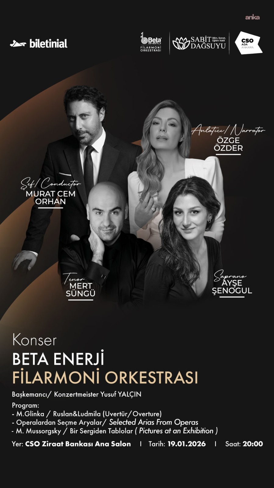 Beta Enerji Filarmoni Orkestrası'nın, 19 Ocak'ta şef Murat Cem Orhan yönetiminde CSO Ada Ankara Ziraat Bankası Ana Salon’daki konserinde soprano Ayşe Şenoğul ve tenor Mert Süngü, solist olarak yer alacak. Oyuncu Özge Özder'in anlatıcı olarak eserlerin hikâyelerini sahneye taşıyacağı konserde, Glinka’dan Puccini’ye, Donizetti’den Kálmán’a uzanan büyülü bir opera yolculuğu ve ardından Mussorgsky’nin efsane eseri “Bir Sergiden Tablolar” Ankaralı dinleyicilerle buluşturulacak.Konserin geliri, bursiyer gençlerin eğitimine... Konserin geliri, Sabit Dağsuyu Vakfı bursiyer gençlerinin eğitimine destek amaçlı ayrılacak. Sabit Dağsuyu Sanat, Bilim ve Eğitim Vakfı (SDV), bu alanlarda sürdürülebilir projeler üreterek topluma kalıcı değerler kazandırmayı amaçlayan bir kuruluş olarak 2024 yılında Adana’da faaliyetlerine başladı. Türkiye'nin ikinci 500 büyük sanayi kuruluşundan biri olan Beta Enerji Şirketi’nin de kurucusu olan Sabit Dağsuyu öncülüğünde kurulan Vakıf, kısa sürede Beta Enerji Filarmoni Orkestrasını sanatseverlerle buluşturdu. Orkestra kısa zamanda güçlü bir müzikal birliktelik sağlamış ve 13 Ocak 2025 tarihinde CSO Ada Ankara, 3 Mayıs 2025 Çukurova Üniversitesi Kongre Merkezi-Adana konserleriyle ülke sanat gündeminde yer aldı.Vakfın amacı; toplumun kültürel, bilimsel ve entelektüel birikimini geliştirmeye katkı sağlamak, bireylerin yaratıcı, eleştirel ve üretken yönlerini destekleyerek nitelikli bir eğitim ortamı oluşturmaya katkıda bulunmak, sanat ve bilimi toplumun her kesimiyle buluşturmak. Vakf, vizyonuyla doğru orantılı olarak genç müzisyenlere Beta Enerji Filarmoni Orkestrası'yla performans sunma fırsatı da yaratıyor.
