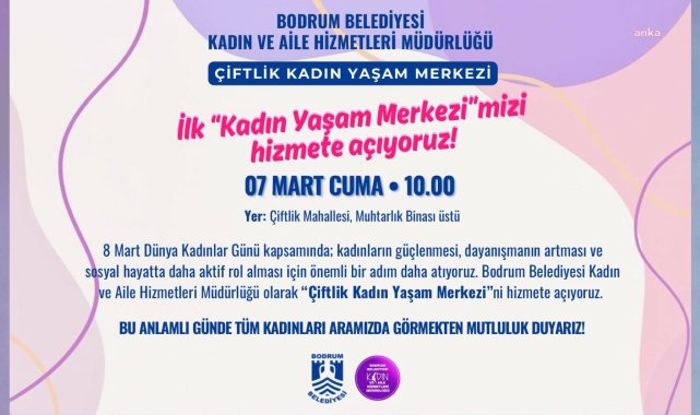 Bodrum Belediyesi, ilk Kadın Yaşam Merkezi'ni 8 Mart Dünya Kadınlar Günü dolayısıyla yarın Çiftlik Mahallesi'nde açıyor.