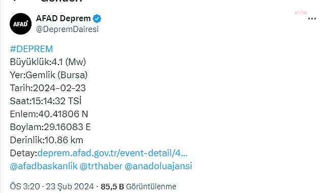Bursa'da saat 15.14'te merkez üssü Gemlik olan 4.1 büyüklüğünde Deprem meydana geldi.AFAD, depremin derinliğini 10.86 kilometre olarak açıkladı. Öte yandan, Kandilli Rasathanesi merkez üssü Bursa-Gemlik olan depremin büyüklüğünü 4.0 olarak duyururken, derinliğinin ise 4.9 kilometre olduğunu açıkladı.
