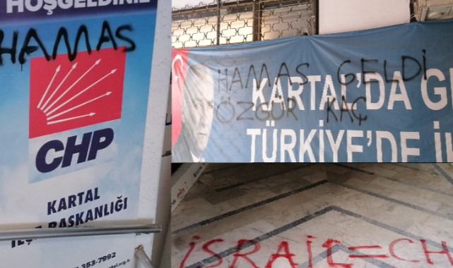 Binanın girişine ve pankartlara ‘Hamas geldi, Özgür kaç’ ve ‘İsrail=CHP’ yazılarının yazıldığı fotoğrafları paylaşan İlçe Başkanı Polat,“Dün gece Kartal İlçe Başkanlığımıza Hamas sempatizanları tarafından yapılan saldırının faillerinin bulunarak adalete teslim edilmesini istiyoruz! Sürecin takipçisi olacağız.Biz Filistin davasını