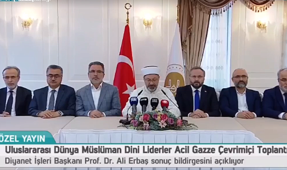 Filistin ve Gazze Konulu Uluslararası Dünya Müslüman Dini Liderler Acil Gazze Çevrim İçi Toplantısı sonunda Diyanet İşleri Başkanı Ali Erbaş dokuz maddelik sonuç bildirgesini açıkladı. "Kudüs Müslümanlarındır. Kudüs ve Gazze Müslüman yurdudur ve kıyamete kadar da öyle kalacaktır inşallah." diyen Erbaş "İşgalci İsrail ve katil yönetici bilmelidir ki zalimlerin sonu hüsrandır, cehennemdir. Zulüm ve haksızlık tarihin hiçbir döneminde insanlığa huzur getirmemiştir. Başta Müslümanlar olmak üzere herkes Siyonizmin kirli planlarına karşı daima ayakta duracaktır" dedi.Gazze'yi ve Filistin'i işgal edenler İslam toplumlarını dağınık ve zayıf gördüklerini için kendilerinde bu cesareti buluyorlar, diyen Erbaş ortak hareket etmeye davet etti.Bu saldırılar insanlığa karşı işlenmiştir diyen Erbaş, BM ve İİT gibi kuruluşların soykırımı durdurmak için bir an önce harekete geçmesi gerektiğini belirtti ve bölgeye barış gücü gönderilmesi çağrısında bulundu