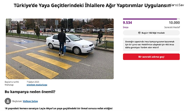 “Kısa vadede "eğitim" veya "farkındalık sağlama" vb. bir yaklaşımla bu krizin çözüleceğine inanmıyorum. Uzun vadede eğitim elbette önemli ancak krizin çözülmesi için kısa vadede "caydırıcı olmak" bir zorunluluk haline gelmiştir. Bu ulusal bir sorundur.Kamuoyundan Yansıyan TepkilerKampanyaya ilk 24 saatte binlerce imza atılırken, destekçilerden biri “Yaya olarak korkuyoruz, geçerken el kol hareketleri ile önlem almaya çalışıyoruz, en önemlisi sürücü olduğumda yaya geçişinde yol verirken inşallah yanımdan bir araba geçmez ya da yanımdaki yayayı fark eder diye düşünür olduk. Lütfen sık kontrol yapılsın ve cezalar artsın” yorumunu paylaştı. Bir başka imzacı ise “Bu cezalar hayata geçerse, sürücüler artık dikkat eder” diyerek taleplere destek verdi.Kampanya: Change.org/YayaGecidi adresindeNe olmuştu?
