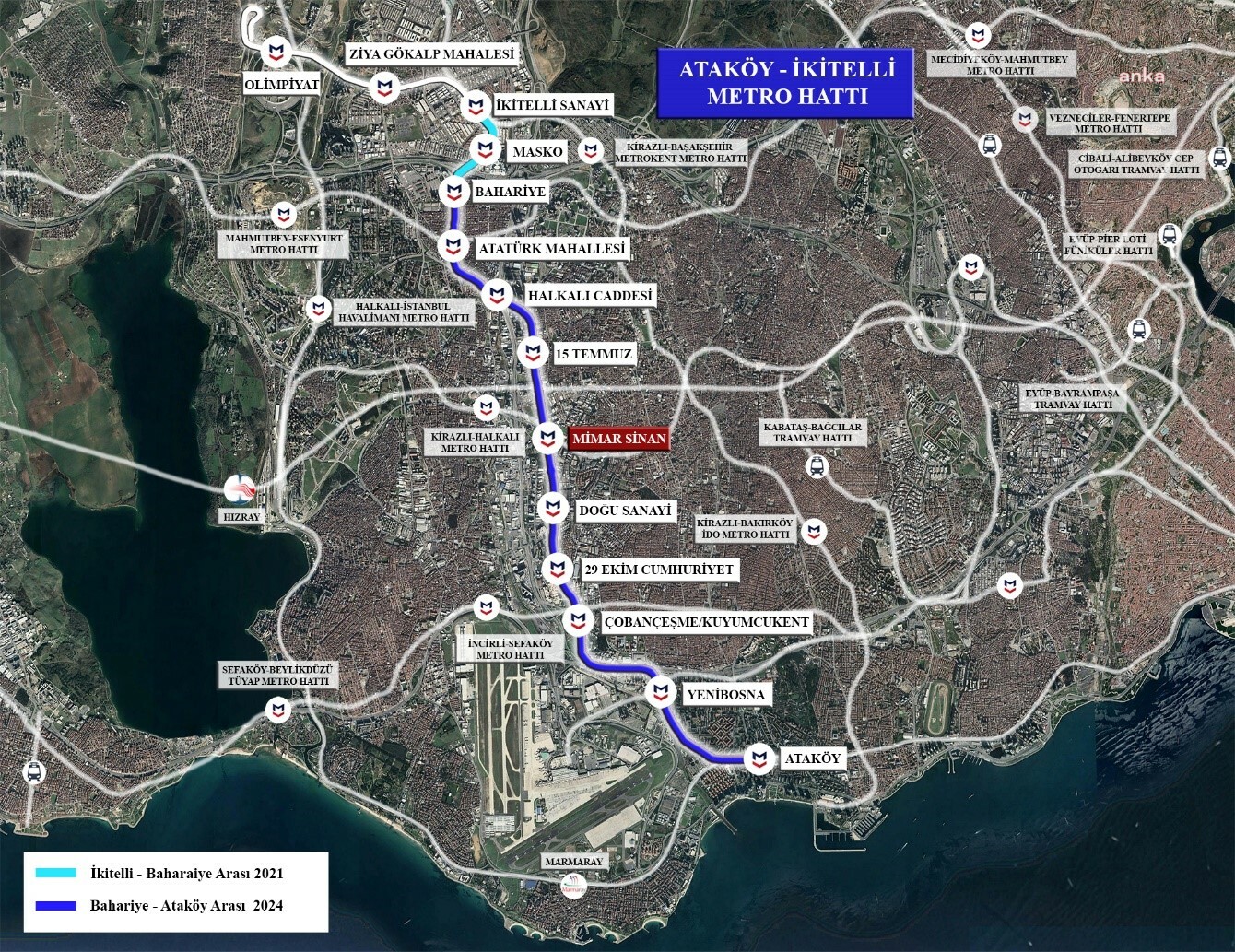 M9 Ataköy-Olimpiyat Metro Hattı'nın Mimar Sinan İstasyonu 30 Ağustos Zafer Bayramı'nda hizmete açıldı. Ekrem İmamoğlu yönetimindeki İBB yönetimi, önceki idare tarafından durdurulan diğer metro hatlarında olduğu gibi, Ataköy-İkitelli metro hattında da çalışmaları yeniden başlatarak 29 Mayıs 2021'de hattın Bahariye ve Masko İstasyonları'nı, 18 Mart 2024 Çanakkale Zaferi'nin 109'uncu yıl dönümünde ise Bahariye-Ataköy kısmını hizmete açtı."Kirazlı - Halkalı metrosu ile entegrasyonu sağlayacak"M9 Ataköy-Olimpiyat Metro Hattı'nın işletmeye alınan Mimar Sinan İstasyonu'nun yapım işleri de tamamlanarak 30 Ağustos itibarıyla yolculu işletmeye hazır hale getirildi. Bu istasyon, yapımı tekrardan başlatılacak olan Kirazlı-Halkalı Metrosu ile entegrasyonu sağlayacak."5 ilçeyi birbirine bağlıyor"2021'de yolcu taşımaya başlayan hattın 2 istasyonlu İkitelli-Bahariye kısmı ve 18 Mart 2024 itibarıyla açılan 8 istasyonlu Bahariye-Ataköy arası ile toplam 10 istasyonla hizmet veren Ataköy-İkitelli Metrosu, Mimar Sinan İstasyonu'nun açılması ile birlikte 11 istasyona ulaştı. Bakırköy, Bahçelievler, Bağcılar, Küçükçekmece ve Başakşehir ilçelerinden geçerek 5 ilçeyi birbirine bağlayan 13,39 kilometrelik hat, sadece 19,5 dakikada ilk istasyondan son istasyona ulaşıyor.