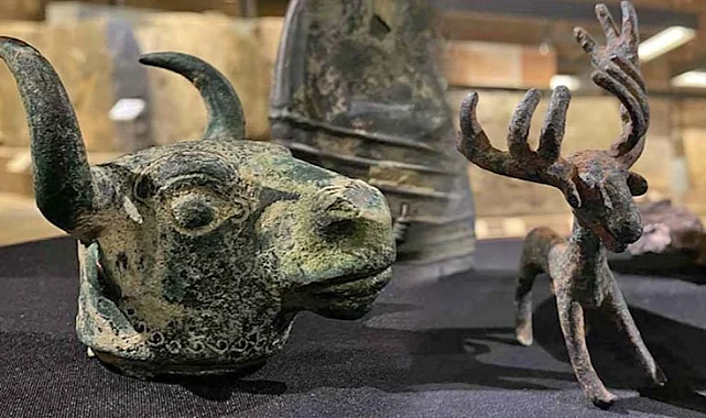 Urartu Kazanlarına Ait Boğa Başı Eklentileri (3 Adet)Boğa başı tutamaklı kazanlar Urartular’da soylu sınıf için birer prestij eşyası sayılmaktaydı. Büyük ve küçük ebatlı, hayvan başı eklentili ve kulplu olmak üzere iki tip olarak kullanılmıştır. Genellikle sallanan kulplar, sade ya da süslemeli bağlantı parçalarıyla donatılmıştı. Eklentili olanlar arasında en fazla boğa başı eklentililer mevcuttur. Bunlar tek parça olarak dökülmüş ve kazanların ağız kenarına dışa dönük olarak perçinlerle tutturulmuştur.At Ayağı Biçimli Mobilya Parçaları (3 Adet)Bronz mobilya aksamının çoğu mezar buluntusudur. Ölümden sonra yaşamın olduğuna inanan Urartular mezarlarını evleri gibi döşemişlerdir. Mezarlarda ele geçirilen mobilya aksamları, günlük kullanımın çok ötesinde özel mezar donatılarıdır. Ahşap mobilyaların bazılarında bronzdan mobilya aksamları kullanılmıştır. Aslan pençesi, boğa ve at toynağı şeklinde bronz mobilya parçaları döküm tekniği ile üretilmişlerdir.