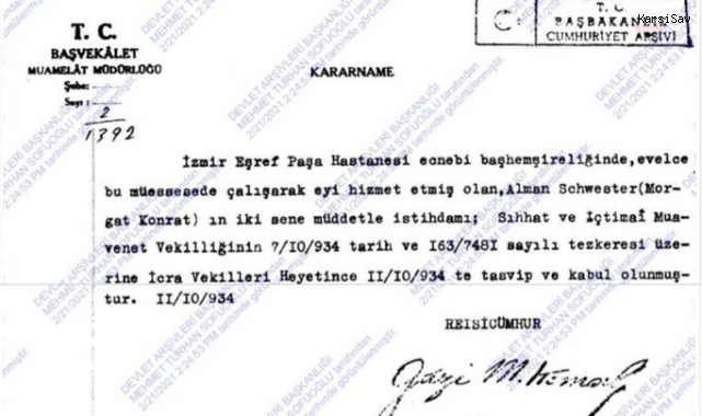 14 Mart Tıp Bayramı dolayısıyla Eşrefpaşa Hastanesi'ni ziyaret ederek hekimler ve sağlık çalışanları ile bir araya gelen İzmir Büyükşehir Belediye Başkanı Cemil Tugay'a günün anısına anlamlı bir hatıra armağan verildi. Mustafa Kemal Atatürk'ün imzasını taşıyan, Eşrefpaşa Hastanesi'nde görevli bir Alman hemşirenin 1934 ve 1937 tarihli çalışma izni belgeleri, Başhekim Doç. Dr. Başak Bayram tarafından Tugay'a takdim edildi.