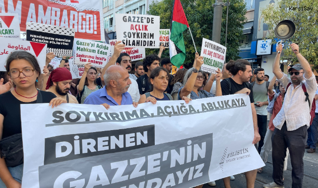 Haber: Hakan KAYA-Kamera: Altuğ EKEN(İSTANBUL) - Filistin Eylem Komitesi Kadıköy Süreyya Operası önünde bir araya gelerek Gazze'ye destek yürüyüşü düzenledi. Yapılan açıklamada Gazze ablukasına derhal son verilmesi ve İsrail'e tam ambargo çağrısı yapıldı. Açıklamanın ardından eyleme katılanlar arasından bir kişi gözaltına alındı.Filistin Eylem Komitesi'nin çağrısıyla Kadıköy Süreyya Operası önünde toplanan yurttaşlar, İsrail'in Filistin halkına yönelik saldırılarını protesto etmek ve Gazze'de yaşanan açlık krizine dikkat çekmek için yürüyüş düzenledi."Soykırıma, açlığa, ablukaya direnen Gazze'nin yanındayız" yazılı pankart açan yurttaşlar, "Nehirden denize özgür Filistin", "Kahrolsun Siyonist İsrail devleti", "Soykırımı izleme tam ambargo uygula" , "Gazze'de çocuklar açlıktan ölüyor" sloganları atarak Süreyya Operası önünden Kilise Meydanı'na (Kalkedon) yürüdü.Yurttaşlar ellerindeki tencere ve tavalara kaşıklarla vurarak İsrail'in Gazze'ye yardım malzemeleri girişini engellemesini protesto etti."Filistinliler yalnızca bomba ve kurşunlarla değil, açlık sebebiyle de hayatını kaybediyor"