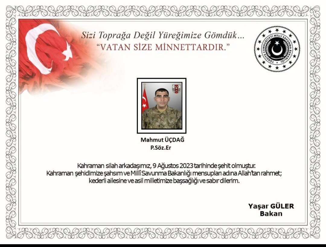 Milli Savunma Bakanlığı'ndan yapılan açıklamada, bölücü terör örgütü mensupları tarafından açılan taciz ateşinde yaralanan Piyade Uzman Çavuş Özkan Lale, Onbaşı Uğur Özdemir ve Piyade Sözleşmeli Er Mahmut Üçdağ'ın hastanede yapılan tüm müdahalelere rağmen kurtarılamayarak şehit düştüğü belirtildi.