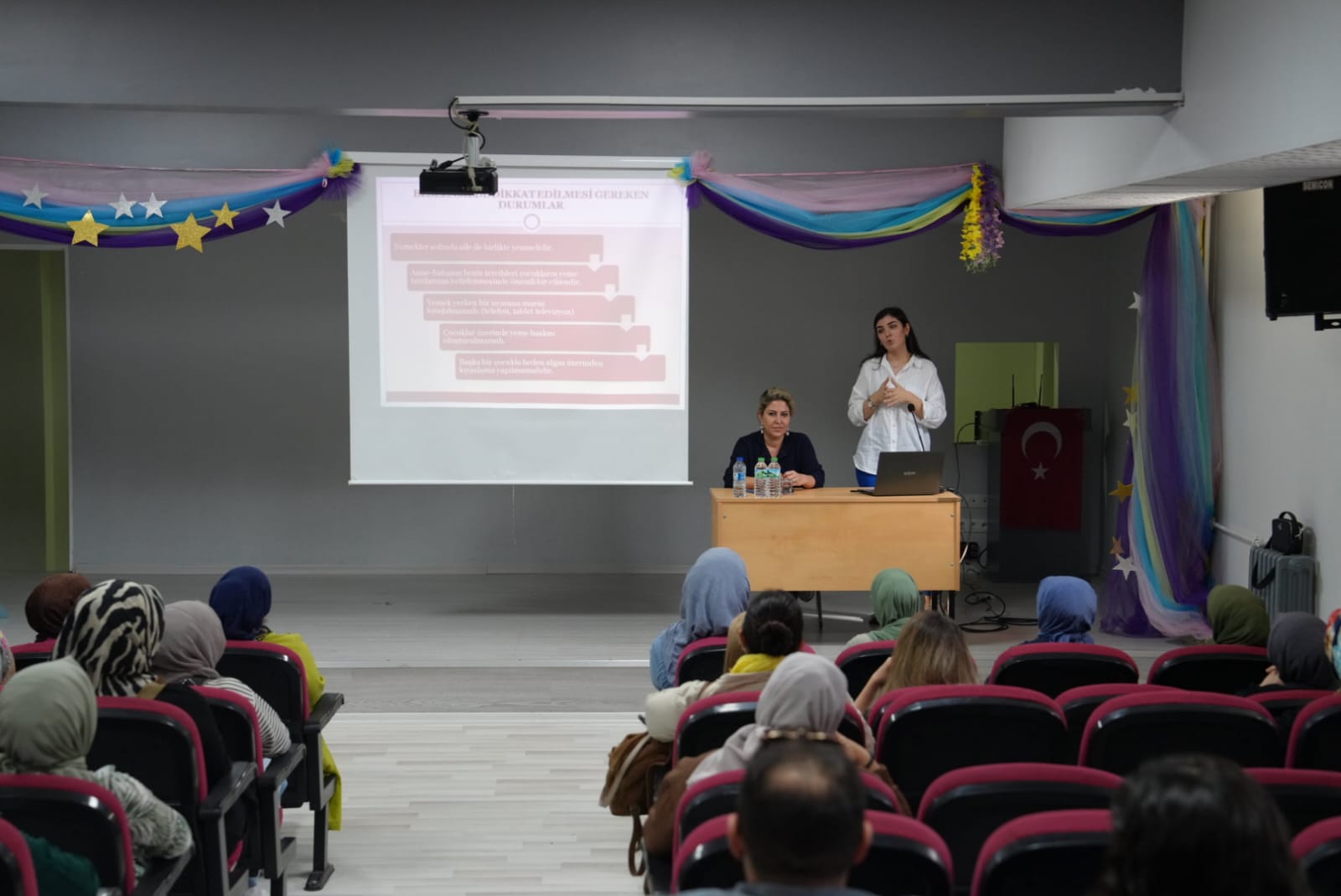Seminerde Psikolojik Danışman Selin Çaylı'nın sunduğu ‘Okula Uyum Süreci Veli Bilgilendirme Semineri’ ile Diyetisyen Dilber Kübra Şimşek'in gerçekleştirdiği ‘Okul Çağı Çocuklarında Sağlıklı Beslenme Semineri’, velilerin yoğun katılımıyla yapıldı.Kartal Belediyesi Kadın ve Aile Hizmetleri Müdürlüğü’nün bugüne kadar Öğretmen Zekeriya Güçer, Hesna Gündeş ve Emine ve Hasan Aytaçman İlkokulu’nda gerçekleştirilen seminerlerin sonuncusu Şehit Üsteğmen Gökhan Yavuz İlkokulu’nda gerçekleştirildi.Okula Uyum Süreci ve Okul Çağı Çocuklarında Sağlıklı BeslenmeSeminerde, Psikolojik Danışman Selin Çaylı, çocukların okula uyum sürecinde dikkat edilmesi gereken noktaları paylaştı ve velilerin sorularını yanıtladı. Ardından Diyetisyen Dilber Kübra Şimşek, okul çağı çocuklarının beslenme düzeni ve sağlıklı alışkanlıklar kazanması üzerine bilgiler aktardı. Gerçekleştirilen son seminere katılan Kartal Belediyesi Kadın ve Aile Hizmetleri Müdürü Deniz Karacan, katkılarından dolayı hem okul yönetimine hem de öğrenci velilerine teşekkür etti. Kartal Belediye Başkanı Gökhan Yüksel’in eğitime yönelik projeleri ve bu alandaki adımları büyük bir heyecanla karşılayarak desteklediğini kaydeden Karacan, Kartal’da kadınlara yönelik faaliyet ve projelerin artarak devam edeceğini belirtti.İlkokuldaki seminerin ardından Kartal Belediyesi Kadın ve Aile Hizmetleri Müdürlüğü’nün faaliyete geçirdiği El Yapımı Çanta Atölyesi’ni ziyaret eden Deniz Karacan, burada kadınlarla bir araya geldi. Eğitmenlerin yardımıyla üretmeye devam eden el işi göz nuru çantaları yapan kadınlarla sohbet eden Karacan, kadın meclisinin de yakında faaliyet göstereceğini belirterek kursiyer kadınları kadın meclisine katılmaya davet etti.