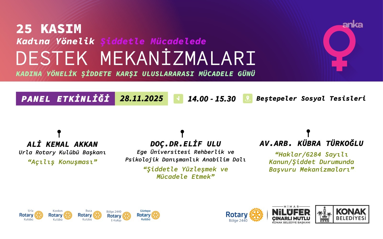 25 Kasım Kadına Yönelik Şiddete Karşı Uluslararası Mücadele Günü etkinlikleri 28 Kasım’da Urla Rotary Kulübü'nün katkılarıyla devam edecek. Beştepeler Sosyal Tesisleri’nde, 14.00-15.30 arası gerçekleştirilecek “Destek Mekanizmaları” başlıklı panelde Urla Rotary Kulübü Başkanı Ali Kemal Akkan, Ege Üniversitesi Rehberlik ve Psikolojik Danışmanlık Anabilim Dalından Doç. Dr. Elif Ulu ve Av. Arb. Kübra Türkoğlu konuşmacı olacak.