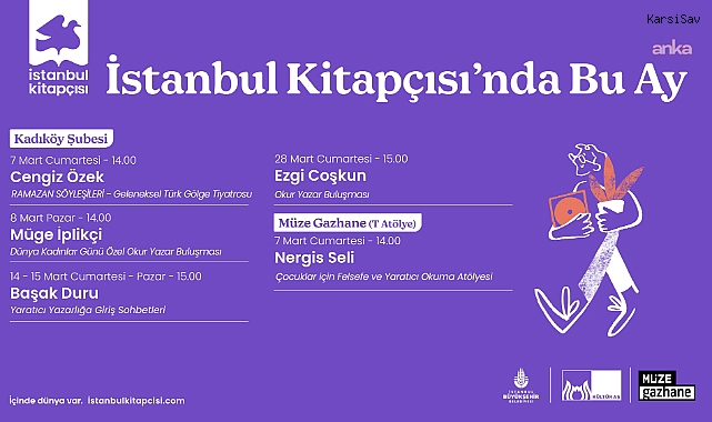 (İSTANBUL) - İstanbul Büyükşehir Belediyesi Kültür AŞ'ye bağlı İstanbul Kitapçısı, mart ayında edebiyatseverleri yazarlarla bir araya getirmeyi sürdürüyor. Kadıköy ve Müze Gazhane şubelerinde düzenlenecek etkinlikler, Okur Yazar Buluşması kapsamında söyleşi, imza günü ve çocuk atölyeleriyle gerçekleştirilecek.Müze Gazhane'de çocuk atölyesi ve imza günü7 Mart 2026 Cumartesi günü saat 14.00'te Nergis Seli, Müze Gazhane'de Çocuk Atölyesi'nde miniklerle buluşacak. Atölyede çocukların felsefe ve yaratıcı okuma deneyimi yaşayacağı etkinlik, imza günü ile devam edecek.Kadıköy şubesinde ramazan söyleşileri ve 8 mart buluşması7 Mart 2026 Cumartesi günü saat 14.00'te Cengiz Özek, İstanbul Kitapçısı Kadıköy şubesinde Ramazan Söyleşileri kapsamında "Geleneksel Türk Gölge Tiyatrosu" ile katılımcılarla bir araya gelecek. 8 Mart 2026 Pazar günü saat 14.00'te ise Kadıköy şubesi, Dünya Kadınlar Günü'ne özel olarak Müge İplikçi'yi ağırlayacak; "Sahte Cennetten Kaçış" kitabı üzerine söyleşi ve imza günü düzenlenecek.Yaratıcı yazarlığa giriş sohbetleriKadıköy şubesinde 14-15 Mart 2026 Cumartesi-Pazar günleri saat 15.00'te Başak Duru ile "Yaratıcı Yazarlığa Giriş Sohbetleri" gerçekleştirilecek.Mart ayı programı Ezgi Coşkun ile tamamlanacakMart ayının kapanış etkinliği, 28 Mart 2026 Cumartesi günü saat 15.00'te Kadıköy şubesinde Ezgi Coşkun'un katılımıyla yapılacak. "İçecekler Olmasaydı" kitabı üzerine düzenlenecek söyleşiyle program sona erecek.