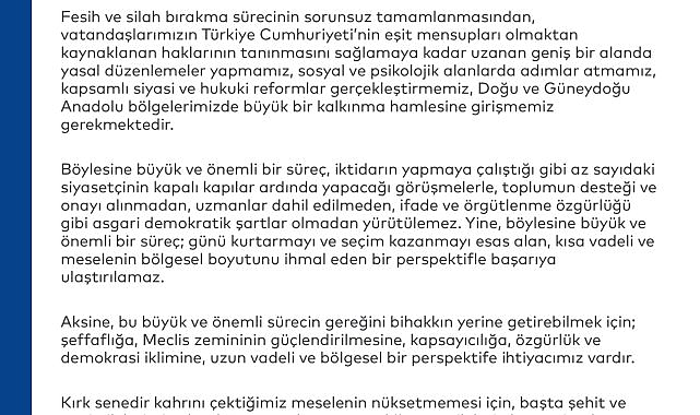 (İSTANBUL)- Silivri Cezaevi'nde tutuklu bulunan İstanbul Büyükşehir Belediye (İBB) Başkanı ve CHP'nin cumhurbaşkanı adayı Ekrem İmamoğlu terör örgütü PKK'nın fesih kararını değerlendirdi. İmamoğlu'nun cumhurbaşkanlığı faaliyetleri için açılan Cumhurbaşkanlığı Aday Ofisi'nden yapılan yazılı açıklamada şu ifadelere yer verildi:"Türk ve Kürt on binlerce vatandaşımızın hayatına mal olan bir dönemin kapanıyor olmasına çok sevindim""Aziz Milletim,Terör örgütü PKK'nın kendisini feshedip, silah bırakma kararı almış olduğunu öğrendim. Geride kalan kırk sene boyunca gençlerimizin, Türk ve Kürt on binlerce vatandaşımızın hayatına mal olan, kaynaklarımızı kurutan bir dönemin nihayet kapanıyor olmasına ülkem adına çok sevindim. Artık konuşmanın, diyalogun, siyasetin, işe koyulmanın vaktidir. O kötü günlere bir daha geri dönmemek için hem içeride hem dışarıda yapmamız gerekenler vardır. Fesih ve silah bırakma sürecinin sorunsuz tamamlanmasından, vatandaşlarımızın Türkiye Cumhuriyeti'nin eşit mensupları olmaktan kaynaklanan haklarının tanınmasını sağlamaya kadar uzanan geniş bir alanda yasal düzenlemeler yapmamız, sosyal ve psikolojik alanlarda adımlar atmamız, kapsamlı siyasi ve hukuki reformlar gerçekleştirmemiz, Doğu ve Güneydoğu Anadolu bölgelerimizde büyük bir kalkınma hamlesine girişmemiz gerekmektedir."Böylesine büyük ve önemli bir süreç; günü kurtarmayı ve seçim kazanmayı esas alan, perspektifle başarıya ulaştırılamaz"Böylesine büyük ve önemli bir süreç, iktidarın yapmaya çalıştığı gibi az sayıdaki siyasetçinin kapalı kapılar ardında yapacağı görüşmelerle, toplumun desteği ve onayı alınmadan, uzmanlar dahil edilmeden, ifade ve örgütlenme özgürlüğü gibi asgari demokratik şartlar olmadan yürütülemez. Yine böylesine büyük ve önemli bir süreç; günü kurtarmayı ve seçim kazanmayı esas alan, kısa vadeli ve meselenin bölgesel boyutunu ihmal eden bir perspektifle başarıya ulaştırılamaz. Aksine, bu büyük ve önemli sürecin gereğini bihakkın yerine getirebilmek için; şeffaflığa, Meclis zemininin güçlendirilmesine, kapsayıcılığa, özgürlük ve demokrasi iklimine, uzun vadeli ve bölgesel bir perspektife ihtiyacımız vardır."Başta şehit ve gazi ailelerimiz olmak üzere acıların yaşandığı tüm ailelerin hassasiyetle dinlenmesi önem arz etmektedir"Kırk senedir kahrını çektiğimiz meselenin nüksetmemesi için, başta şehit ve gazi ailelerimiz olmak üzere acıların yaşandığı tüm ailelerin hassasiyetle dinlenmesi, sürece dair aydınlatılmaları ve helalliklerinin alınması büyük bir önem arz etmektedir. Ulusal güvenliği ilgilendiren hassas kısımları hariç olmak üzere, sürecin bütün boyutlarının kamuoyunca bilinir ve şeffaf olması, milletin sürece ortak edilmesi, farklı kanaatlere, sivil toplumun ve ilgili uzmanların önerilerine kulak verilmesi, herkesin sözünü söylemesine izin verecek bir siyasi atmosferin ve hukuk düzeninin oluşması elzemdir. Bu çerçevede, süreci salimen tamamına erdirebilmek üzere, TBMM'de bir genel görüşme açılması, ardından da Mecliste temsil olunan bütün partilerin katıldığı bir komisyon oluşturularak konunun ele alınması gerekmektedir."Ülkemize ve milletimize büyük sıkıntılar yaşatan bir dönemin sona eriyor olmasına ne kadar sevinsek az"Sevgili vatandaşlarım, ülkemize ve milletimize büyük sıkıntılar yaşatan bir dönemin sona eriyor olmasına ne kadar sevinsek az. Öte yandan, şunun da idrakinde olmamız lazım: Kırk senedir büyük acılara yol açan bu meselenin bir geçmişi ve bir kısmı devletimizin yanlış uygulamalarından kaynaklanan köklü sebepleri var. Kürt vatandaşlarımızın kendilerini Cumhuriyetimizin eşit vatandaşları olarak hissetmelerini sağlayamamış, sınırlarımızın haricindeki Kürtlere güvenlik perspektifiyle bakmış olmamız bu sebeplerin başta gelenleri. Ülkemizin bu en köklü meselesini bir daha nüksetmeyecek biçimde çözebilmemiz için Türkiye Cumhuriyeti'nin bütün fertlerini eşit hak sahibi vatandaşlar, Cumhuriyetimizin eşit hissedarları, vatandaşımız olmayan Kürtleri de kardeşlerimiz kılmamız gerekiyor."Kürt vatandaşlarımızı herkesle eşit hissettirebilirsek, bölgenin büyük gücü, Ortadoğu'nun kutup yıldızı haline getirebiliriz"Kürt vatandaşlarımızı herkesle eşit hissettirebilir, vatandaşımız olmayan Kürtleri kardeşlerimiz kılabilirsek, sorunumuzu çözmekle kalmaz, ülkemizi gerçek manasıyla bölgenin büyük gücü, Ortadoğu'nun kutup yıldızı haline getirebiliriz. Cumhuriyet'in eşit yurttaşları ve vatanımızın eşit hissedarları olarak kendimizi güvende ve hak sahibi hissetmemiz, sadece adaletin gereği değil, Cumhuriyetimizin sürdürülebilirliği ve demokrasimizin derinleşmesi açısından da tarihsel bir zorunluluktur. Bu prensipler bizi birlikte millet yapan; ortak vatan, ortak kader, ortak gelecek idealinde birleştiren en güçlü temel olacaktır."Ülkemizin hiçbir sorunu çözümsüz değildir"Türkiye'min güzel insanları, Ülkemizin hiçbir sorunu çözümsüz değildir. Sağduyu, feraset, müzakere, akıl, bilim ve en önemlisi cumhuriyet, demokrasi ve vatan sevgisiyle her meseleye çözüm bulabiliriz. Yeter ki milletimizi ayrıştırmayalım.Yeter ki siyasi rakiplerimizi düşmanlaştırmayalım. Yeter ki hukukun üstünlüğünden ve adaletten sapmayalım.Yeter ki tüm gücü bir avuç ayrıcalıklı kişinin elinden alıp millete geri verelim. Ve yeter ki ortak geleceğimiz olan Cumhuriyetimizin kazanımlarına ve millet egemenliğine sahip çıkalım. Ay yıldızlı bayrağımız hepimizi altında toplayacak kadar yüce; cennet vatanımız ise tüm yurttaşlarımıza yetecek kadar büyük ve kucaklayıcıdır."Kürt meselesi de dahil ülkemizin köklü meselele