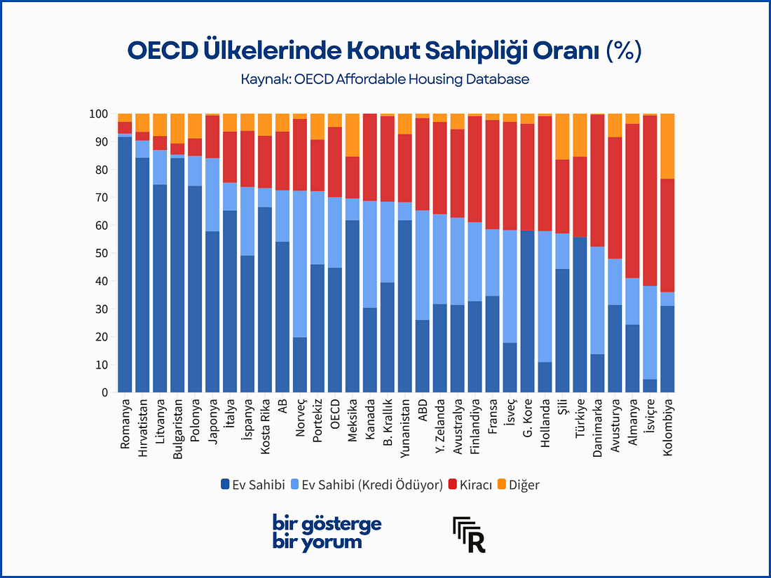 OECD ülkeleriyle yapılan karşılaştırmada, Türkiye’nin kredi ödemesi devam eden haneler de hesaba katıldığında ev sahipliği oranı bakımından görece düşük ülkeler arasında yer aldığı aktarıldı. Buna karşılık Kiracılık oranının, birçok Avrupa ülkesi, Güney Kore, ABD, İngiltere ve Avustralya’ya kıyasla daha düşük kaldığı belirtildi.