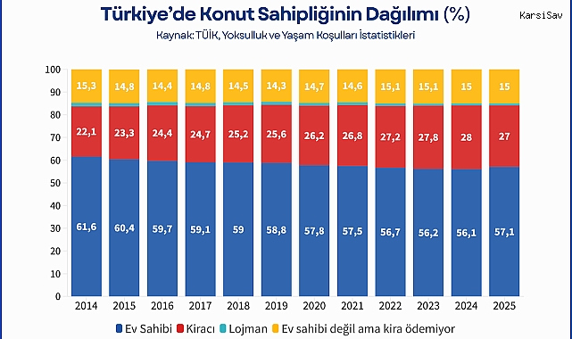 Değerlendirmede, bu değişimin yalnızca küçük bir istatistiksel kayma olmadığı, milyonlarca hanenin kiracı konumuna geçtiği anlamına geldiği vurgulandı. 2025 verilerinde ise sınırlı bir toparlanma işareti görüldüğü; Ev Sahipliği oranının yüzde 57,1’e yükseldiği, kiracı oranının ise yüzde 27’ye gerilediği kaydedildi. Ancak bu değişimin kalıcı bir eğilim mi yoksa geçici bir dalgalanma mı olduğunun henüz net olmadığı belirtildi.