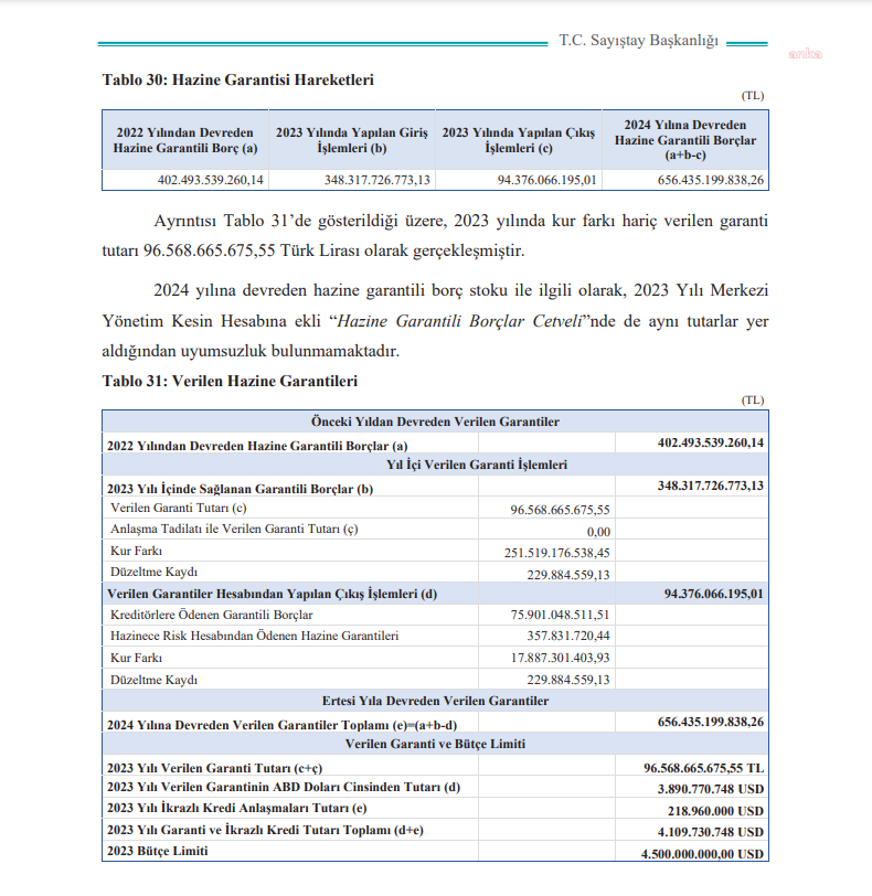 (ANKARA) - Sayıştay'ın 2023 Genel Uygunluk Bildirimi Raporu'na göre; 2023 yılında hazine garantili dış kredi kullanan kamu kurum ve kuruluşlarına verilen 96 milyar 568 milyon 665 bin 675,55 TL garanti tutarının, 17 milyar 887 milyon 301 bin 403 TL'si kur farkına ödendi.Sayıştay'ın 2023 yılı Genel Uygunluk Bildirimi Raporu yayınlandı. Rapora göre; 2023 yılında kur farkı hariç verilen garanti tutarı 96 milyar 568 milyon 665 bin 675,55 TL olarak gerçekleşti. Bu kapsamda, hazine garantili dış kredi kullanan kamu kurum ve kuruluşlarının ödediği kur farkı, 17 milyar 887 milyon 301 bin 403 TL oldu. Hazine garantili borçlar geçmiş yıllardan gelenler de dahil 2024 yılına 656 milyar 435 milyon 199 bin TL devretti.