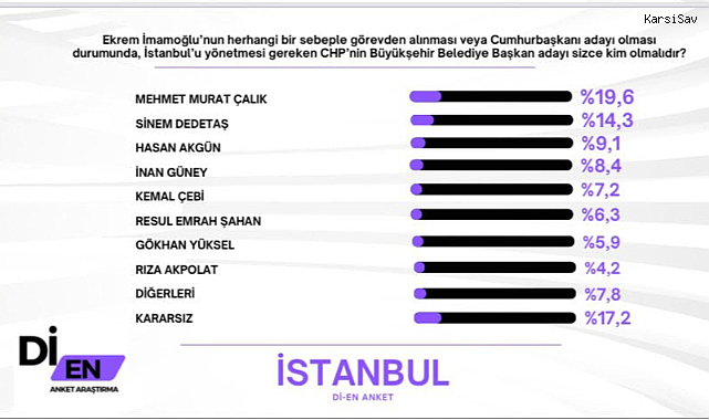 Ekrem İmamoğlu, Cumhuriyet Halk Partisi’nin Cumhurbaşkanı adayını belirleyecek ön seçimde aday olduğunu duyurmuştu. Bir yandan da İmamoğlu hakkında peş peşe başlatılan soruşturmalar göz önünde bulundurulduğunda kamuoyu Türkiye’nin en büyük belediyesi olan İstanbul Büyükşehir Belediyesi’nin yeni başkanının kim olacağını konuşuyor. Dİ-EN Anket Araştırma da Ekrem İmamoğlu’nun olası ayrılığı durumunda CHP’nin İstanbul Büyükşehir Belediye Başkan adayı olarak kimi görmek istediklerini sordu. MURAT ÇALIK İSTANBUL ANKETİNDEN BİRİNCİ ÇIKTIBu ay İstanbul’un 39 ilçesinde, yaş, eğitim ve cinsiyet kotasına göre belirlenmiş 9 bin 605 kişiyle yüz yüze anket gerçekleştiren araştırma şirketi, en güçlü adayın dikkat çekici bir farkla CHP’li Beylikdüzü Belediye Başkanı Mehmet Murat Çalık olduğu sonucuna ulaştı. Anketin katılımcılarının yüzde 19,6’sı Çalık’ı seçerken, yüzde 14,3’ü ise CHP’li Üsküdar Belediye Başkanı Sinem Dedetaş’ı tercih etti. Murat Çalık ve Sinem Dedataş’ı, yüzde 9,1 ile Büyükçekmece Belediye Başkanı Hasan Akgün, yüzde 8,4 ile Beyoğlu Belediye Başkanı İnan Güney takip etti. Kararsızların yüzde 17,2 çıkması ve yeni İBB Başkanı belirleyecek oranda olması da dikkatleri çekti. Dİ-EN Araştırma’nın ulaştığı sonuçlar şu şekilde: - Mehmet Murat Çalık (Beylikdüzü) yüzde 19,6- Sinem Dedetaş (Üsküdar) yüzde 14,3- Hasan Akgün (Büyükçekmece) yüzde 9,1- İnan Güney (Beyoğlu) yüzde 8,4- Kemal Çebi (Küçükçekmece) yüzde 7,2- Resul Emrah Şahan (Şişli) yüzde 6,3- Gökhan Yüksel (Kartal) yüzde 5,9- Rıza Akpolat (Beşiktaş) yüzde 4,2- Diğerleri yüzde 7,8- Kararsız yüzde 17,2 İSTANBULLU ÖNCELİĞİ DEPREME VERDİYaklaşık 10 bin İstanbullu seçmenle yüz yüze yapılan anketin tek sonucu bu değil. Araştırma şirketi aynı zamanda seçmenin önceliklerini de ölçtü. Ankette katılımcılara “İBB Başkanının değişmesi durumunda yerine yeni gelecek kişinin aşağıdaki özelliklerden hangilerine sahip olmasını tercih edersiniz” sorusu yöneltildi. Katılımcıların yüzde 48.70’i yeni belediye başkanının yaklaşan ‘Büyük İstanbul Depremi’ne karşı çalışmalar yapmasını “çok tercih edeceğini” belirtirken, katılımcıların yüzde 40,60’ı da yeni belediye başkanının ulaşım konusunda çalışmalar yapmasını “çok tercih edeceğini” kaydetti.