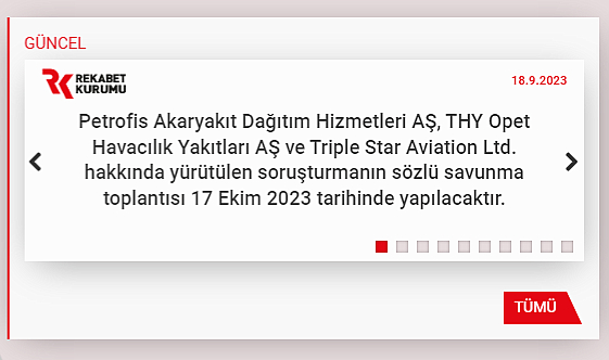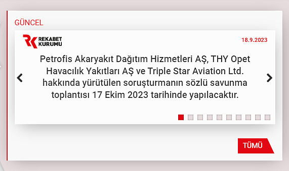 Petrofis Akaryakıt Dağıtım Hizmetleri AŞ, THY Opet Havacılık Yakıtları AŞ ve Triple Star Aviation Ltd. hakkında yürütülen soruşturmanın sözlü savunma toplantısı 17 Ekim 2023 tarihinde yapılacaktır.