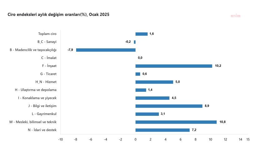 Toplam cironun alt detaylarına bakıldığında; 2025 yılı Ocak ayında aylık sanayi sektörü ciro endeksi yüzde 0,2 azaldı, inşaat ciro endeksi yüzde 10,2 arttı, ticaret ciro endeksi yüzde 0,6 arttı, hizmet ciro endeksi yüzde 5,0 arttı.