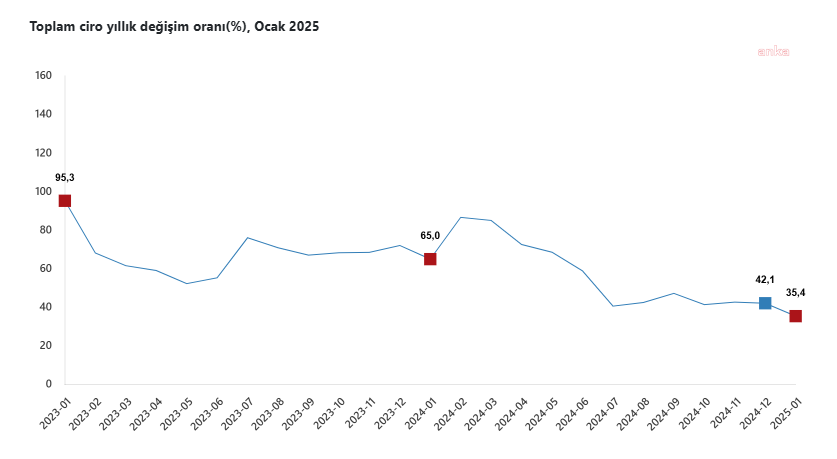 (ANKARA) - Türkiye İstatistik Kurumu'nun (TÜİK), 2025 Ocak dönemine ilişkin ciro endekslerine göre, toplam ciro yıllık yüzde 35,4 arttı. Sanayi, inşaat, ticaret ve hizmet sektörleri toplamında ciro endeksi, 2025 yılı Ocak ayında aylık yüzde 1,6 arttı. TÜİK, 2025 yılı Ocak ayına ilişkin ciro endekslerini açıkladı. Buna göre, sanayi, inşaat, ticaret ve hizmet sektörleri toplamında ciro endeksi, 2025 yılı Ocak ayında yıllık yüzde 35,4 arttı.