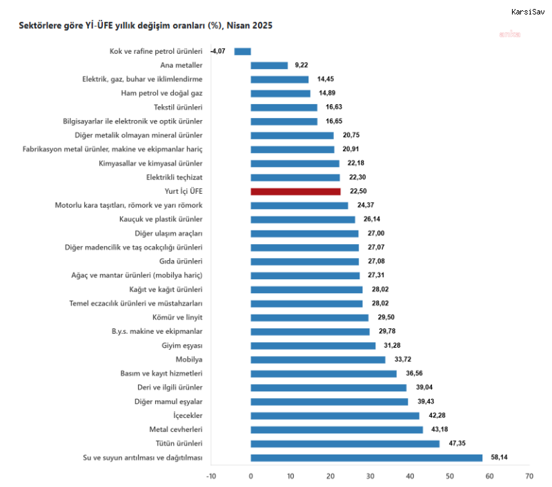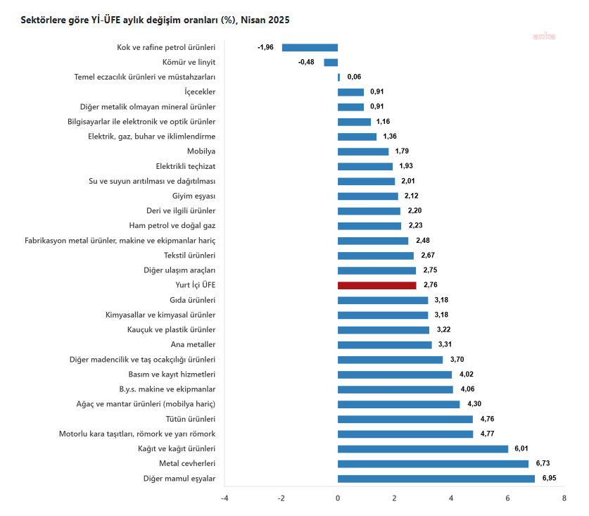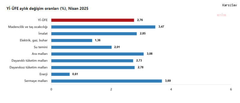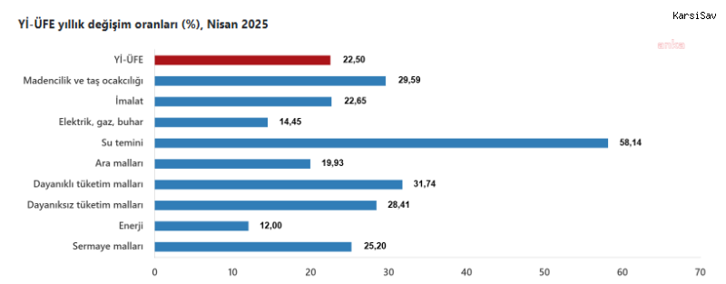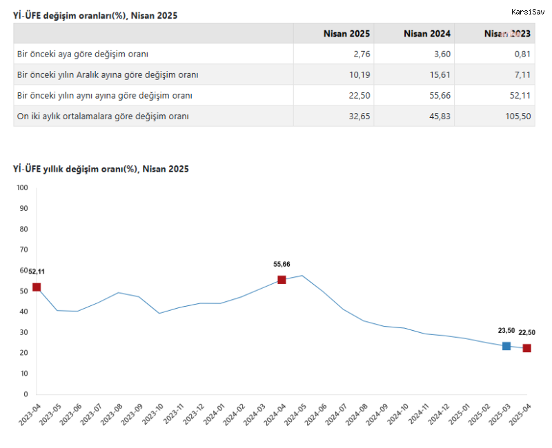 (ANKARA) - TÜİK, Nisan 2025'e ait enflasyon verilerini açıkladı. Buna göre tüketici fiyat endeksi (TÜFE) nisanda, bir önceki aya göre yüzde 3, bir önceki yılın aralık ayına göre yüzde 13,36, bir önceki yılın aynı ayına göre yüzde 37,86 ve on iki aylık ortalamalara göre yüzde 48,73 arttı. Gıda ve alkolsüz içeceklerde yıllık yüzde 36,09 arttı En yüksek ağırlığa sahip 3 ana harcama grubundan gıda ve alkolsüz içeceklerde yıllık artış yüzde 36,09, ulaştırmada yüzde 22,76 ve konutta yüzde 74,07 olarak gerçekleşti. İlgili ana grupların yıllık değişime olan etkileri ise gıda ve alkolsüz içeceklerde yüzde 9,21, ulaştırmada yüzde 3,84 ve konutta yüzde 9,98 oldu. Aylık değişimler ise gıda ve alkolsüz içeceklerde yüzde 2,01, ulaştırmada yüzde 3,80 ve konutta yüzde 4,66 artış olarak gerçekleşti. İlgili ana grupların aylık değişime etkileri gıda ve alkolsüz içeceklerde yüzde 0,51, ulaştırmada yüzde 0,57 ve konutta yüzde 0,74 oldu. Endekste kapsanan 143 temel başlıktan (Amaca Göre Bireysel Tüketim Sınıflaması-COICOP 5'li Düzey) Nisan 2025 itibarıyla, 18 temel başlığın endeksinde düşüş gerçekleşirken, 4 temel başlığın endeksinde değişim olmadı. 121 temel başlığın endeksinde de artış oldu. Özel kapsamlı TÜFE göstergesi yıllık yüzde 36,81, aylık yüzde 3,10 arttı İşlenmemiş gıda ürünleri, enerji, alkollü içkiler ve tütün ile altın hariç TÜFE'deki değişim, nisanda bir önceki aya göre yüzde 3,10, bir önceki yılın aralık ayına göre yüzde 12,71, bir önceki yılın aynı ayına göre yüzde 36,81 ve on iki aylık ortalamalara göre yüzde 47,82 yükseldi. Yurt İçi Üretici Fiyat Endeksi (Yİ-ÜFE) yıllık yüzde 22,50, aylık yüzde 2,76 arttı Yİ-ÜFE ise Nisan 2025'te bir önceki aya göre yüzde 2,76, bir önceki yılın aralık ayına göre yüzde 10,19, bir önceki yılın aynı ayına göre yüzde 22,50 ve on iki aylık ortalamalara göre yüzde 32,65 yükseldi. Yİ-ÜFE imalat ürünlerindeki yıllık artış yüzde 22,65 oldu Sanayinin dört sektörünün yıllık değişimlerine bakıldığında ise madencilik ve taş ocakçılığında yüzde 29,59, imalatta yüzde 22,65, elektrik, gaz üretimi ve dağıtımında yüzde 14,45 ve su temininde yüzde 58,14 artış gerçekleşti. Ana sanayi gruplarının yıllık değişimlerinde de ara malları yüzde 19,93, dayanıklı tüketim malları yüzde 31,74, dayanıksız tüketim malları yüzde 28,41, enerji yüzde 12 ve sermaye malları yüzde 25,20 arttı. Yİ-ÜFE imalat ürünlerinde aylık yüzde 2,85 arttı Sanayinin dört sektörünün aylık değişimlerine bakıldığında da madencilik ve taş ocakçılığında yüzde 3,47, imalatta yüzde 2,85, elektrik, gaz üretimi ve dağıtımında yüzde 1,36 ve su temininde yüzde 2,01 artış gerçekleşti. Ana sanayi gruplarından ara mallarında aylık artış yüzde 3,08, dayanıklı tüketim mallarında yüzde 2,73, dayanıksız tüketim mallarında yüzde 2,78, enerjide yüzde 0,61 ve sermaye mallarında yüzde 3,69 oldu.