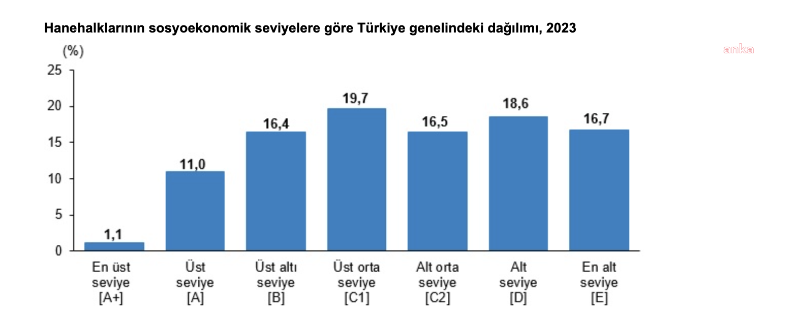 (ANKARA) - Türkiye İstatistik Kurumu (TÜİK) ilk kez hanehalklarının sosyoekonomik verilerini açıkladı. Buna göre hanelerin yalnızca yüzde 1,1'i en üst seviyede yer alırken şehir olarak ise İstanbul, Ankara ve İzmir üst gruplarda.Türkiye İstatistik Kurumu (TÜİK) tarihinde ilk kez hanehalklarının sosyoekonomik verilerini açıkladı. 2022, 2023 ve 2024 verileriyle hazırlanan raporun referans dönemi 2023 yılı olarak belirlendi. 26 milyondan fazla hane için hesaplanan Sosyoekonomik Seviye (SES) skoruna göre hanehalklarının yüzde 1,1'i sosyoekonomik seviye gruplarına göre en üst seviyede yer aldıSosyoekonomik seviye gruplarına göre; Türkiye'deki hanehalklarının yüzde 1,1'i en üst seviyede,yüzde 11,0'ı üst seviyede,yüzde 16,4'ü üst altı seviyede, yüzde 19,7'si üst orta seviyede, yüzde 16,5'i alt orta seviyede, yüzde 18,6'sı alt seviyede, yüzde 16,7'si ise en alt seviyede kayıtlara geçti.İllere göre incelendiğinde; Ankara'daki hanehalklarının yüzde 2,5'inin en üst seviyede, yüzde 16,5'inin üst seviyede, yüzde 20,0'sinin üst altı seviyede, yüzde 17,5'inin üst orta seviyede,yüzde 17,4'ünün alt orta seviyede, yüzde 14,0'ının alt seviyede, yüzde 12,2'sinin ise en alt seviyede yer aldığı görüldü.İstanbul'daki hanehalklarının sosyoekonomik seviye gruplarına göre dağılımına bakıldığında; yüzde 2,4'ünün en üst seviyede, yüzde 16,4'ünün üst seviyede yüzde 19,0'unun üst altı seviyede, yüzde 18,6'sının üst orta seviyede, yüzde 17,2'sinin alt orta seviyede, yüzde 13,8'inin alt seviyede, yüzde 12,6'sının en alt seviyede bulunduğu görüldü.İzmir'deki hanehalklarının ise yüzde 1,2'si en üst seviyede, yüzde 12,4'ü üst seviyede, yüzde 17,6'sı üst altı seviyede, yüzde 18,8'i üst orta seviyede, yüzde 17,8'i alt orta seviyede, yüzde 17,1'i alt seviyede, yüzde 15,0'ı en alt seviyede yer aldı.