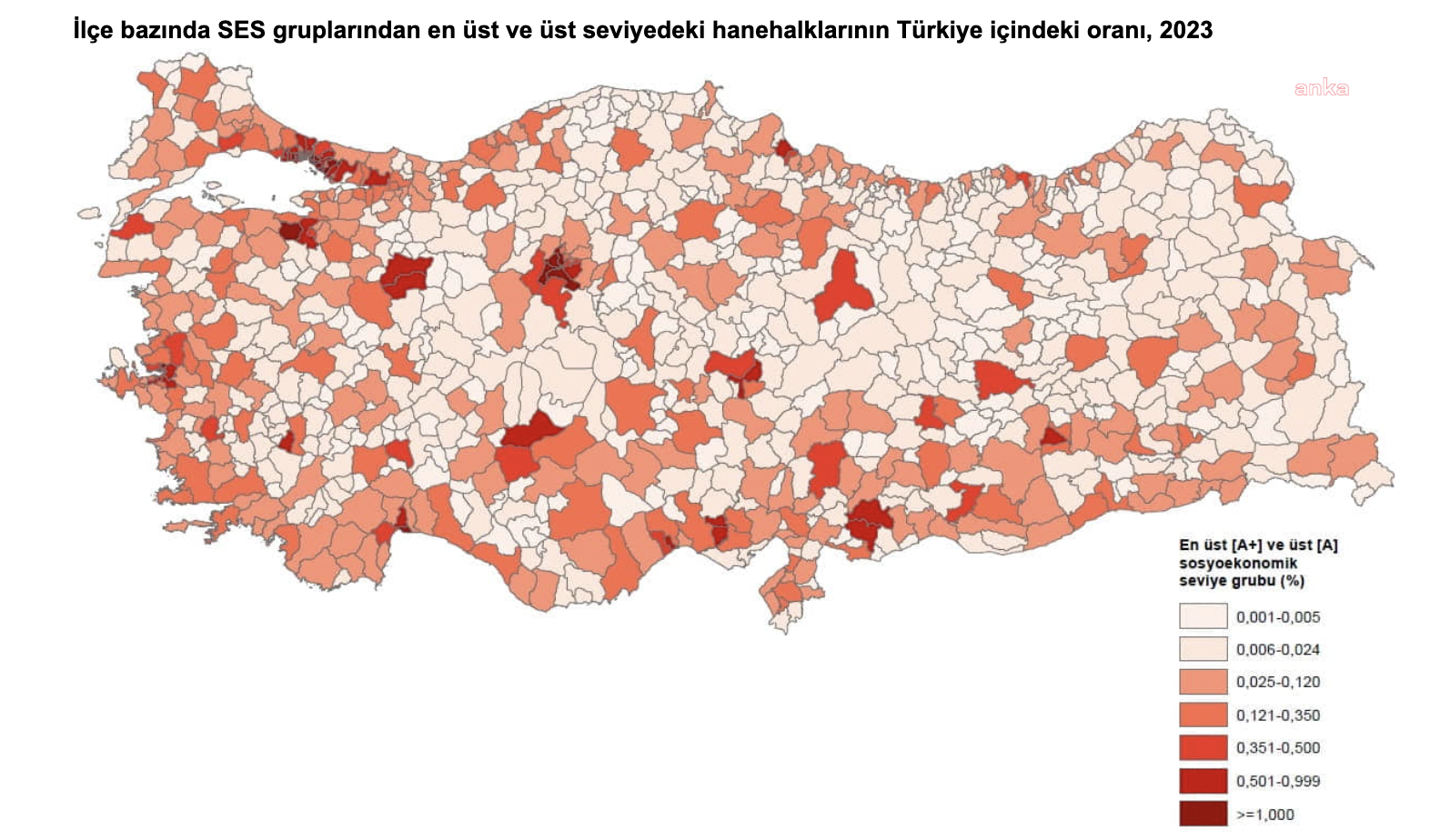 En üst ve üst seviye grubunda yer alan hanehalklarının yüzde 28,6'sı İstanbul'da yer aldıİl düzeyinde en üst sosyoekonomik seviye gruplarındaki hanehalkları, Türkiye içindeki oranlarına göre sıralandığında, bu seviyelerdeki hanehalklarının en fazla olduğu iller yüzde 28,6 ile İstanbul, yüzde 11,5 ile Ankara, yüzde 6,7 ile İzmir, yüzde 3,9 ile Bursa ve yüzde 3,3 ile Antalya oldu.En üst ve üst seviye grubunda yer alan hanehalklarının yüzde 4,1'i Çankaya'da yer aldıİlçe düzeyinde en üst sosyoekonomik seviye gruplarındaki hanehalkları, Türkiye içindeki oranlarına göre sıralandığında, bu seviyelerdeki hanehalklarının en fazla olduğu ilçeler sırasıyla yüzde 4,1 ile Çankaya (Ankara), yüzde 2,4 ile Kadıköy (İstanbul), yüzde 1,9 ile Yenimahalle (Ankara) oldu.Sosyoekonomik seviyesi en yüksek ilçe Çankaya olduİlçeler ortalama sosyoekonomik seviyeye göre sıralandığında, skoru en yüksek yedi ilçe sırasıyla Çankaya (Ankara), Kadıköy (İstanbul), Beşiktaş (İstanbul), Etimesgut (Ankara), Nilüfer (Bursa), Bakırköy (İstanbul) ve Güzelbahçe (İzmir) ilçeleri oldu.Skoru en düşük yedi ilçe ise sırasıyla Çamoluk (Giresun), Derebucak (Konya), Doğanşar (Sivas), Felahiye (Kayseri), Dikmen (Sinop), Pınarbaşı (Kastamonu), Bayramören (Çankırı) ilçeleri oldu.