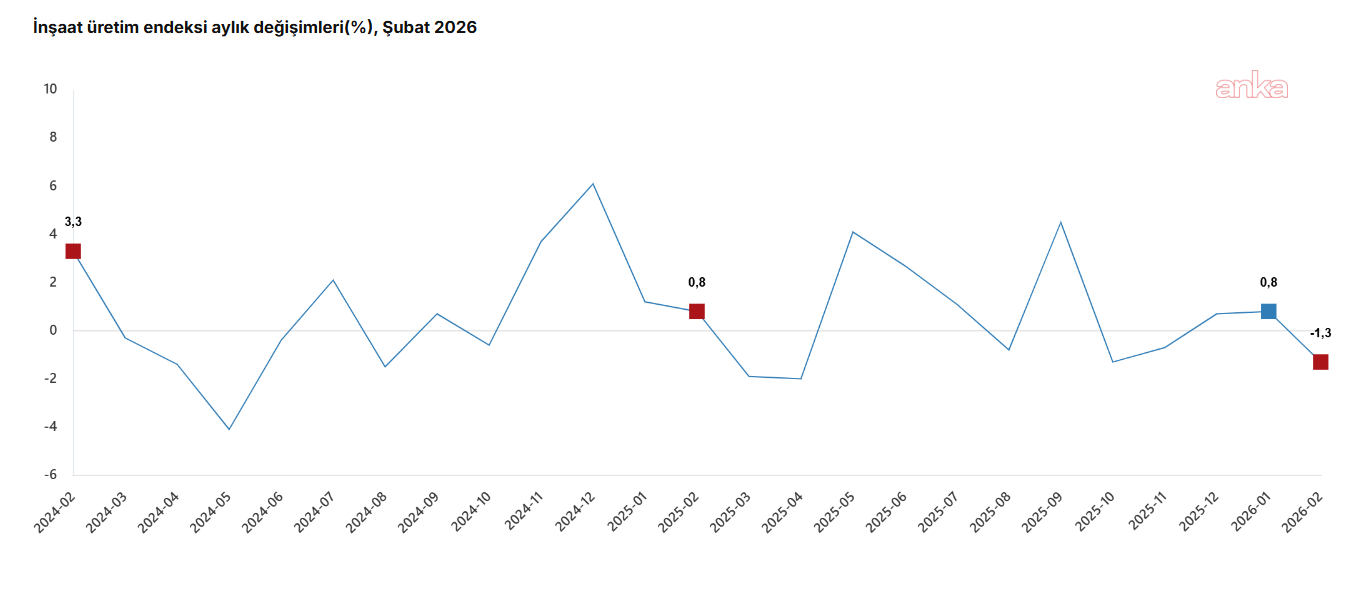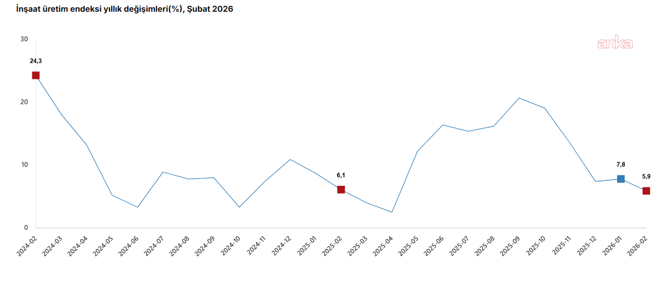 (ANKARA) - Türkiye İstatistik Kurumu (TÜİK), 'İnşaat Üretim Endeksi'nin şubat ayında yıllık yüzde 5,9 artarken, aylık yüzde 1,3 azaldığını açıkladı.TÜİK, şubat ayına ilişkin "İnşaat Üretim Endeksi"ni açıkladı. TÜİK'ten yapılan açıklamada şunlar kaydedildi:"İnşaat üretimi yıllık yüzde 5,9 arttı. İnşaatın alt sektörleri (2021=100 referans yıllı) incelendiğinde, 2026 yılı Şubat ayında bina inşaatı sektörü endeksi bir önceki yılın aynı ayına göre yüzde 4,9 arttı, bina dışı yapıların inşaatı sektörü endeksi yüzde 12,0 arttı ve özel inşaat faaliyetleri sektörü endeksi yüzde 5,5 arttı.İnşaat üretimi aylık yüzde 1,3 azaldı. İnşaatın alt sektörleri incelendiğinde, 2026 yılı Şubat ayında bina inşaatı sektörü endeksi bir önceki aya göre yüzde 2,5 azaldı, bina dışı yapıların inşaatı sektörü endeksi yüzde 1,2 arttı ve özel inşaat faaliyetleri sektörü endeksi yüzde 1,3 arttı."