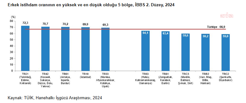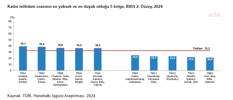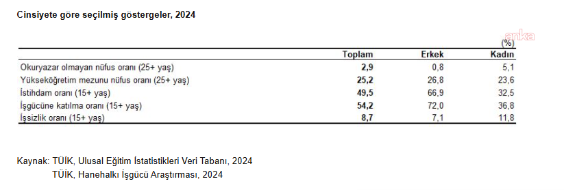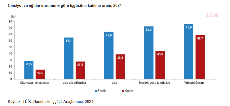 Kadınların işgücüne katılım oranı yüzde 36,8, erkeklerin yüzde 72,0 olduHanehalkı İşgücü Araştırması sonuçlarına göre, 2024 yılında 15 ve üstü yaştaki nüfusun işgücüne katılma oranının yüzde 54,2 oranında olduğu görüldü. Bu oran kadınlarda yüzde 36,8, erkeklerde ise yüzde 72,0 olarak kaydedildi. İşgücüne katılma oranı eğitim durumuna göre incelendiğinde, kadınların eğitim seviyesi yükseldikçe işgücüne daha fazla katıldıkları görüldüğü belirtilerek, "Okuryazar olmayan kadınların işgücüne katılma oranı yüzde 14,6, lise altı eğitimli kadınların işgücüne katılma oranı yüzde 27,5, lise mezunu kadınların işgücüne katılma oranı yüzde 38,5, mesleki veya teknik lise mezunu kadınların işgücüne katılma oranı yüzde 43,8 iken, yükseköğretim mezunu kadınların işgücüne katılma oranı yüzde 68,7 oldu" bulgularına yer verildi.