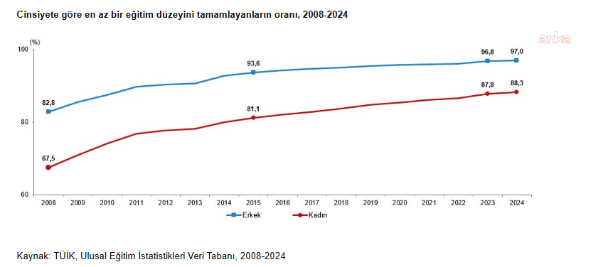 En az bir eğitim düzeyini tamamlayan 25 yaş ve üstü nüfusun toplam nüfus içindeki oranı arttıUlusal Eğitim İstatistiklerine göre, 25 yaş ve üzeri nüfusun ortalama eğitim süresinin yıllara göre arttığının görüldüğü belirtilen bültende, "Türkiye geneli için 25 yaş ve üzeri nüfusun ortalama eğitim süresi 2011 yılında 7,3 yıl, kadınlarda 6,4 yıl, erkeklerde 8,3 yıl iken, 2024 yılında Türkiye genelinde 9,5 yıl, kadınlarda 8,8 yıl, erkeklerde 10,2 yıl oldu" tespitine yer verildi.Aynı istatistiklere göre en az bir eğitim düzeyini tamamlayan 25 yaş ve üstü nüfusun toplam nüfus içindeki oranının 2008-2024 yılları arasında arttığı kaydedildi. En az bir eğitim düzeyini tamamlayan 25 ve daha yukarı yaştaki bireylerin toplam nüfus içindeki oranı, 2008 yılında yüzde 75,1 iken 2024 yılında yüzde 92,6 oldu. Bu oran cinsiyete göre incelendiğinde, 2008 yılında en az bir eğitim düzeyini tamamlayan 25 ve daha yukarı yaştaki kadınların oranı yüzde 67,5, erkeklerin oranı yüzde 82,8 iken, bu oran 2024 yılında kadınlarda yüzde 88,3, erkeklerde ise yüzde 97,0 oldu. "Ebeveynin eğitim seviyesi yükseldikçe bireyin eğitim düzeyi yükseliyor"Ulusal Eğitim İstatistiklerine göre yüksekokul ve fakülte, yüksek lisans ve doktora mezunu olan 25 yaş ve üstü nüfusun toplam nüfus içindeki oranı, 2008 yılında yüzde 9,1 iken 2024 yılında yüzde 25,2 olduğu kaydedilerek, "Bu oran cinsiyete göre incelendiğinde, 2008 yılında yükseköğretim mezunu olan 25 ve daha yukarı yaştaki kadınların oranı yüzde 7,1, erkeklerin oranı yüzde 11,2 iken bu oran 2024 yılında kadınlarda yüzde 23,6, erkeklerde ise yüzde 26,8 oldu" tespiti yapıldı. Aynı istatistik sonuçlarına göre, ebeveynin tamamladığı eğitim düzeyine göre ferdin tamamladığı eğitim düzeyi oranına bakıldığında, ebeveynin eğitim seviyesi yükseldikçe bireyin eğitim düzeyinin yükseldiği görüldüğü ifade edildi. Bültende, "Annesi yükseköğretim mezunu olan 25 yaş ve üzeri nüfusun 2024 yılında yüzde 84,4'ünün yükseköğretim mezunu olduğu görüldü" denildi.