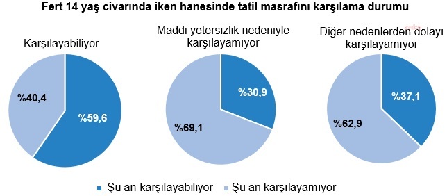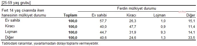 YÜZDE 47,7'Sİ KİRACI14 yaş civarındayken ailesi ev sahibi olanların, yüzde 57,7'sinin şu an oturduğu konutta mülkiyet durumu "ev sahibi", yüzde 26,3'ünün ise "kiracı" olduğu tahmin edildi. Mülkiyet durumu "kiracı" olanların, yüzde 40'ı şu an oturduğu konutun sahibi iken yüzde 47,7'sinin ise kirada oturduğu belirlendi.ESKİDEN TATİLE GİDEMEYENLERİN YÜZDE 70'İ BUGÜN DE GİDEMİYORFertler 14 yaşındayken tüm ailesiyle bir haftalık tatil masrafını karşılayabilen hanelerde yaşayanların yüzde 59,6'sının şu anki hanesi ile bir haftalık tatil masrafını karşılayabildiği, maddi yetersizlik nedeniyle tatil masrafını karşılayamayan hanelerde yaşayanların ise yüzde 69,1'inin şu anki hanesi ile de bu masrafı karşılayamadığı görüldü.ANNESİ YÜKSEKÖĞRETİM MEZUNU OLANLARIN ÜNİVERSİTE BİTİRME ORANI YÜKSEKKendisi 14 yaş civarında iken annesi yükseköğretim mezunu olanların, şu anki eğitim seviyesi incelendiğinde yüzde 83,5'inin yükseköğretim mezunu olduğu belirlendi. 14 yaş civarında iken babası yükseköğretim mezunu olan fertlerin ise yüzde 79,5'inin ise yükseköğretim mezunu olduğu saptandı.Fert 14 yaş civarında iken annesi lise altı eğitim kademesini bitirenlerin şu anki eğitim durumu incelendiğinde yüzde 56,3'ünün lise altı, yüzde 21,9'unun lise ve dengi, yüzde 21,9'unun ise yükseköğretim mezunu olduğu görüldü. Fertler 14 yaş civarında iken babası lise altı eğitim seviyesini bitirenlerin ise yüzde 60'ının lise altı olduğu tespit edildi.