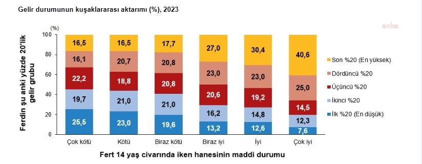 Kendisi 14 yaş civarında iken ailesinin maddi durumunu "çok kötü" olarak belirtenlerin yüzde 16,5'i şu an en yüksek yüzde 20'lik gelir grubunda yer alırken, yüzde 25,5'i ise en düşük grupta yer aldı. Kendisi 14 yaş civarında iken ailesinin maddi durumunu "çok iyi" olarak belirtenlerin yüzde 40,6'sı şu an en yüksek gelir grubunda iken yüzde 7,6'sı ise en düşük grupta yer aldı.