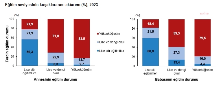 Kendisi 14 yaş civarında iken annesi yükseköğretim mezunu olanların, şu anki eğitim seviyesi incelendiğinde yüzde 83,5'inin yükseköğretim mezunu olduğu belirlendi. 14 yaş civarında iken babası yükseköğretim mezunu olan fertlerin ise yüzde 79,5'inin ise yükseköğretim mezunu olduğu saptandı.Fert 14 yaş civarında iken annesi lise altı eğitim kademesini bitirenlerin şu anki eğitim durumu incelendiğinde yüzde 56,3'ünün lise altı, yüzde 21,9'unun lise ve dengi, yüzde 21,9'unun ise yükseköğretim mezunu olduğu görüldü. Fertler 14 yaş civarında iken babası lise altı eğitim seviyesini bitirenlerin ise yüzde 60'ının lise altı olduğu tespit edildi.
