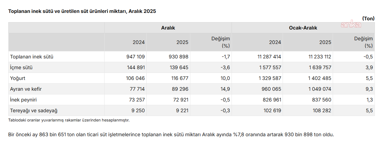(ANKARA) - TÜİK'in Süt ve Süt Ürünleri Üretimi Aralık 2025 verilerine göre ticari süt işletmelerince 930 bin 898 ton inek sütü toplandı.