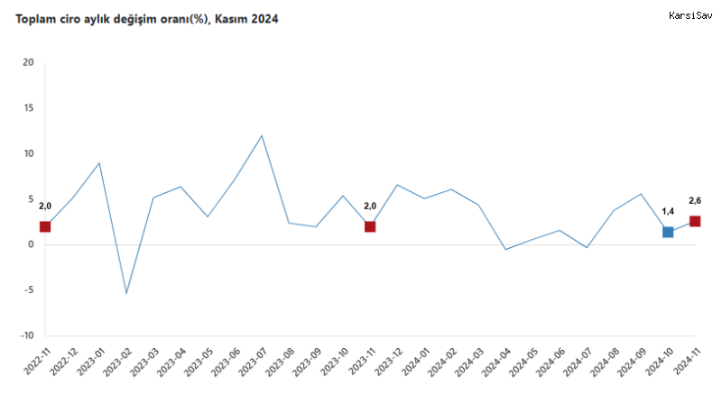 (ANKARA) - Türkiye İstatistik Kurumu'nun (TÜİK) 2024 yılının Kasım ayına ait ciro endeksleri verilerine göre, Toplam ciro yıllık yüzde 42,4 arttı. TÜİK, 2024 yılının Kasım ayına ait ciro endekslerini açıkladı. Sanayi, inşaat, ticaret ve hizmet sektörleri toplamında ciro endeksi (2021=100), 2024 yılı Kasım ayında yıllık yüzde 42,4 arttı. Toplam cironun alt detaylarına bakıldığında; 2024 yılı Kasım ayında yıllık sanayi sektörü ciro endeksi yüzde 30,1, inşaat ciro endeksi yüzde 55,9, ticaret ciro endeksi yüzde 44,6, hizmet ciro endeksi yüzde 53,3 arttı. Toplam ciro aylık yüzde 2,6 arttı Sanayi, inşaat, ticaret ve hizmet sektörleri toplamında ciro endeksi (2021=100), 2024 yılı Kasım ayında aylık yüzde 2,6 arttı. Toplam cironun alt detaylarına bakıldığında; 2024 yılı Kasım ayında aylık sanayi sektörü ciro endeksi yüzde 2,3, inşaat ciro endeksi yüzde 0,9, ticaret ciro endeksi yüzde 3,1, hizmet ciro endeksi yüzde 2,1 arttı.