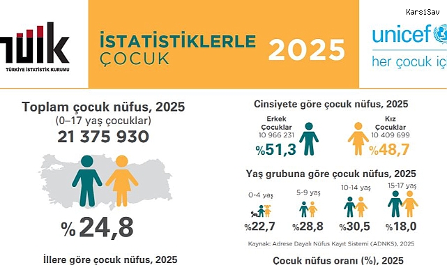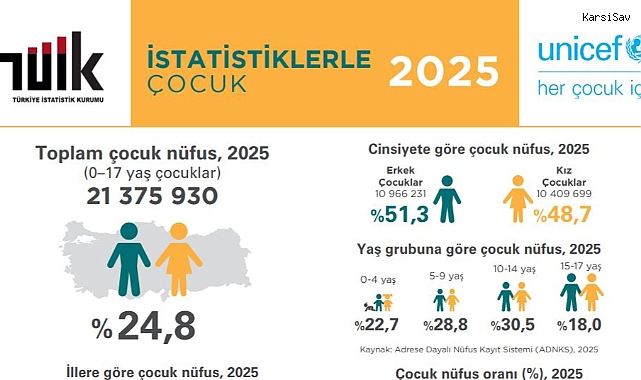 Adrese Dayalı Nüfus Kayıt Sistemi sonuçlarına göre, 31 Aralık 2025 itibarıyla Türkiye nüfusu 86 milyon 92 bin 168 kişi oldu. Bunun 21 milyon 375 bin 930’unu çocuklar oluşturdu. Çocuk nüfusun yüzde 51,3’ünü erkekler, yüzde 48,7’sini kızlar meydana getirdi.