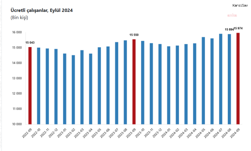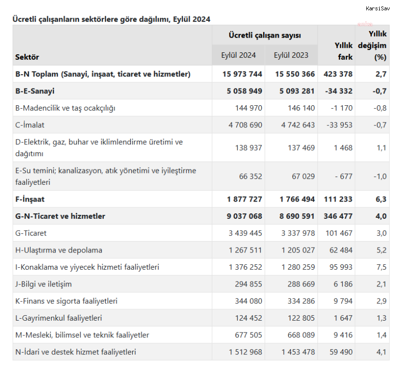 Buna göre sanayi, inşaat ve ticaret-hizmet sektörleri toplamında ücretli çalışan sayısı 2024 Eylül ayında bir önceki yılın aynı ayına göre yüzde 2,7 arttı. Ücretli çalışan sayısı bir önceki yılın aynı ayında 15 milyon 550 bin 366 kişi iken, 2024 yılı Eylül ayında 15 milyon 973 bin 744 kişi oldu.