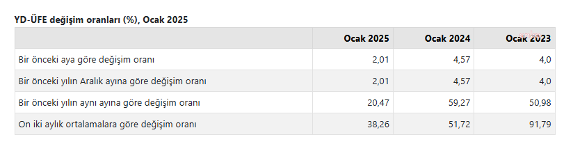 (ANKARA) - Türkiye İstatistik Kurumu'nun (TÜİK) 2025 yılı Ocak ayı verilerine göre; Yurt dışı üretici fiyat endeksi yıllık yüzde 20,47 artarken aylık yüzde 2,01 oldu. TÜİK, 2025'in ocak ayına ait yurt dışı üretici fiyat endeksini açıkladı. Buna göre, YD-ÜFE 2025 yılı ocak ayında yüzde 2,01 artış, bir önceki yılın aralık ayına göre yüzde 2,01 artış, bir önceki yılın aynı ayına göre yüzde 20,47 artış ve on iki aylık ortalamalara göre yüzde 38,26 artış gösterdi.