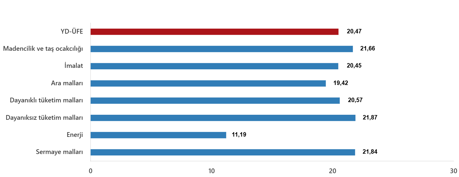 YD-ÜFE imalat ürünlerinde yıllık yüzde 20,45 arttıSanayinin iki sektörünün yıllık değişimleri; madencilik ve taş ocakçılığında yüzde 21,66 artış, imalatta yüzde 20,45 artış olarak gerçekleşti.