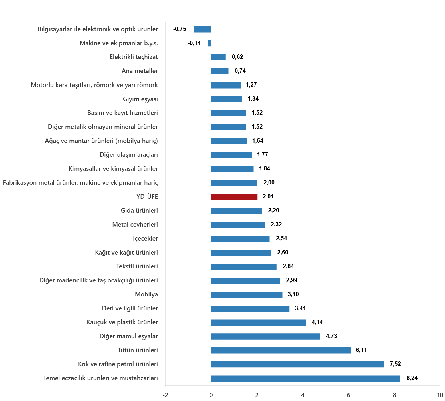 YD-ÜFE imalat ürünlerinde aylık yüzde 1,99 arttıSanayinin iki sektörünün aylık değişimleri; madencilik ve taş ocakçılığında yüzde 2,63 artış, imalatta yüzde 1,99 artış olarak gerçekleşti.