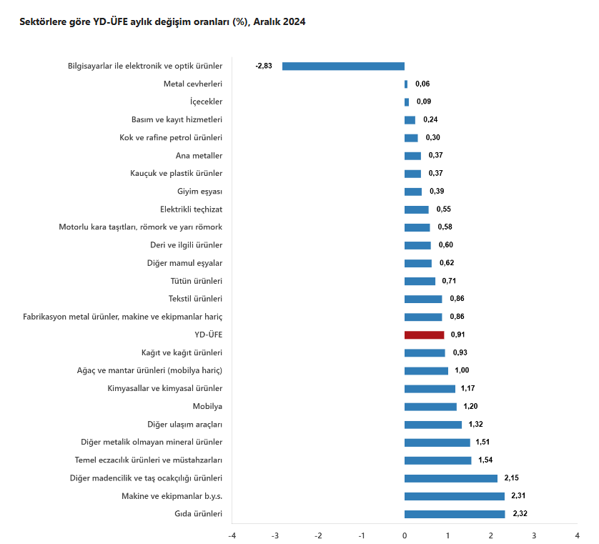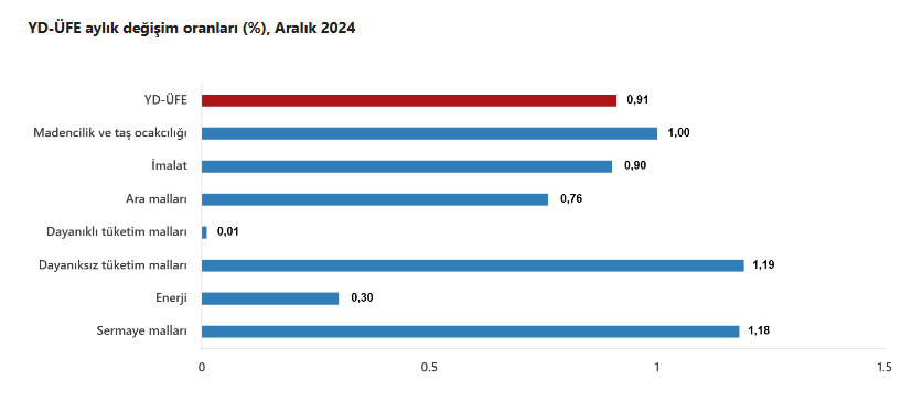YD-ÜFE imalat ürünlerinde aylık yüzde 0,90 arttıSanayinin iki sektörünün aylık değişimleri; madencilik ve taş ocakçılığında yüzde 1,0 artış, imalatta yüzde 0,90 artış oldu.Ana sanayi gruplarının aylık değişimleri; ara mallarında yüzde 0,76 artış, dayanıklı tüketim mallarında yüzde 0,01 artış, dayanıksız tüketim mallarında yüzde 1,19 artış, enerjide yüzde 0,30 artış, sermaye mallarında yüzde 1,18 artış oldu.