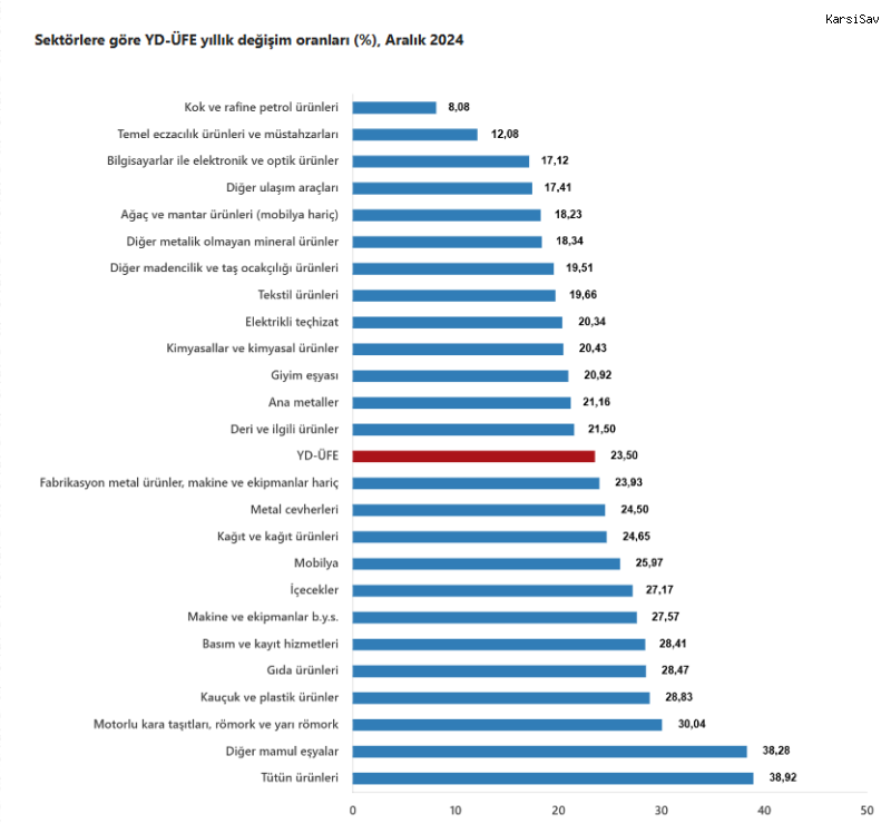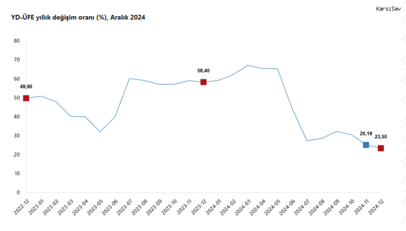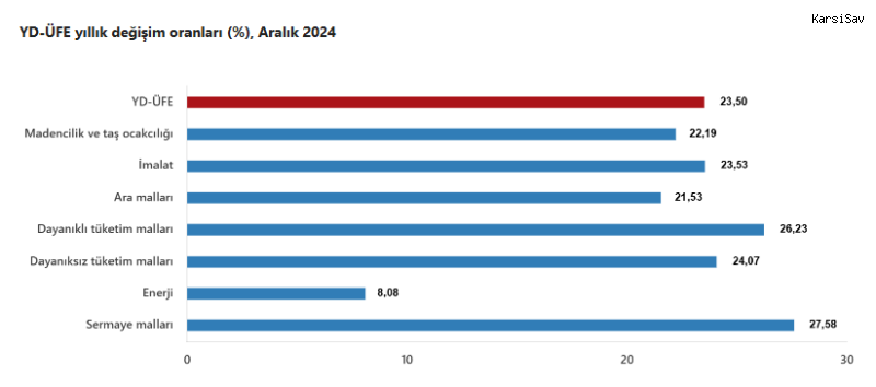 (ANKARA) - Türkiye İstatistik Kurumu'nun (TÜİK) 2024 yılı Aralık ayı verilerine göre; Yurt dışı üretici fiyat endeksi yıllık yüzde 23,50, aylık ise yüzde 0,91 oranında arttı.Türkiye İstatistik Kurumu (TÜİK), 2024'ün Aralık ayına ait yurt dışı üretici fiyat endeksini açıkladı. Buna göre YD-ÜFE 2024 yılı Aralık ayında bir önceki aya göre yüzde 0,91 artış, bir önceki yılın aralık ayına göre yüzde 23,50 artış, bir önceki yılın aynı ayına göre yüzde 23,50 artış ve on iki aylık ortalamalara göre yüzde 41,55 artış gösterdi.YD-ÜFE imalat ürünlerinde yıllık yüzde 23,53 arttıSanayinin iki sektörünün yıllık değişimleri; madencilik ve taş ocakçılığında yüzde 22,19 artış, imalatta yüzde 23,53 artış olarak gerçekleşti.Ana sanayi gruplarının yıllık değişimleri; ara mallarında yüzde 21,53 artış, dayanıklı tüketim mallarında yüzde 26,23 artış, dayanıksız tüketim mallarında yüzde 24,07 artış, enerjide yüzde 8,08 artış, sermaye mallarında yüzde 27,58 artış olarak kayıtlara geçti.