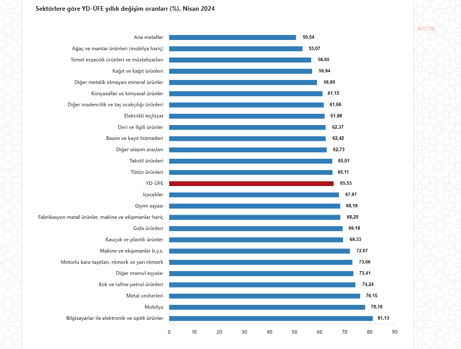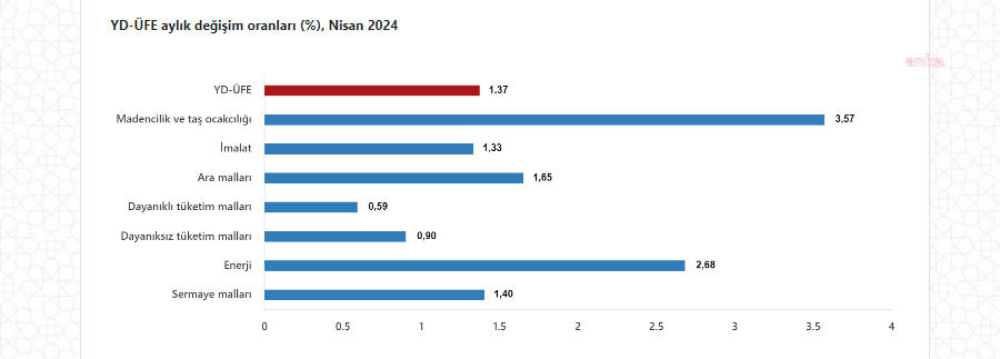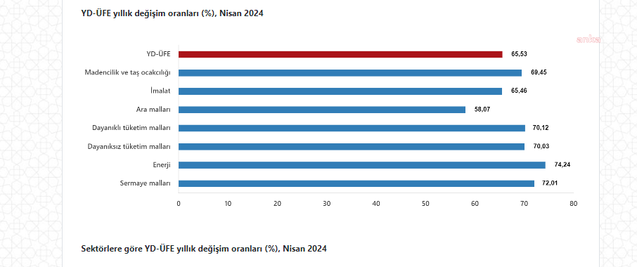 Sanayinin iki sektörünün yıllık değişimleri; madencilik ve taş ocakçılığında yüzde 69,45 artış, imalatta yüzde 65,46 artış olarak belirlendi. Bu sektörlerde aylık değişimler; madencilik ve taş ocakçılığında yüzde 3,57 artış, imalatta yüzde 1,33 artış olarak gerçekleşti.Ana sanayi gruplarının yıllık değişimleri; ara mallarında yüzde 58,07 artış, dayanıklı tüketim mallarında yüzde 70,12 artış, dayanıksız tüketim mallarında yüzde 70,03 artış, enerjide yüzde 74,24 artış, sermaye mallarında yüzde 72,01 artış olarak gerçekleşti. Ana sanayi gruplarının aylık değişimleri; ara mallarında yüzde 1,65, dayanıklı tüketim mallarında yüzde 0,59, dayanıksız tüketim mallarında yüzde 0,90, enerjide yüzde 2,68, sermaye mallarında yüzde 1,40 artış olarak tespit edildi.