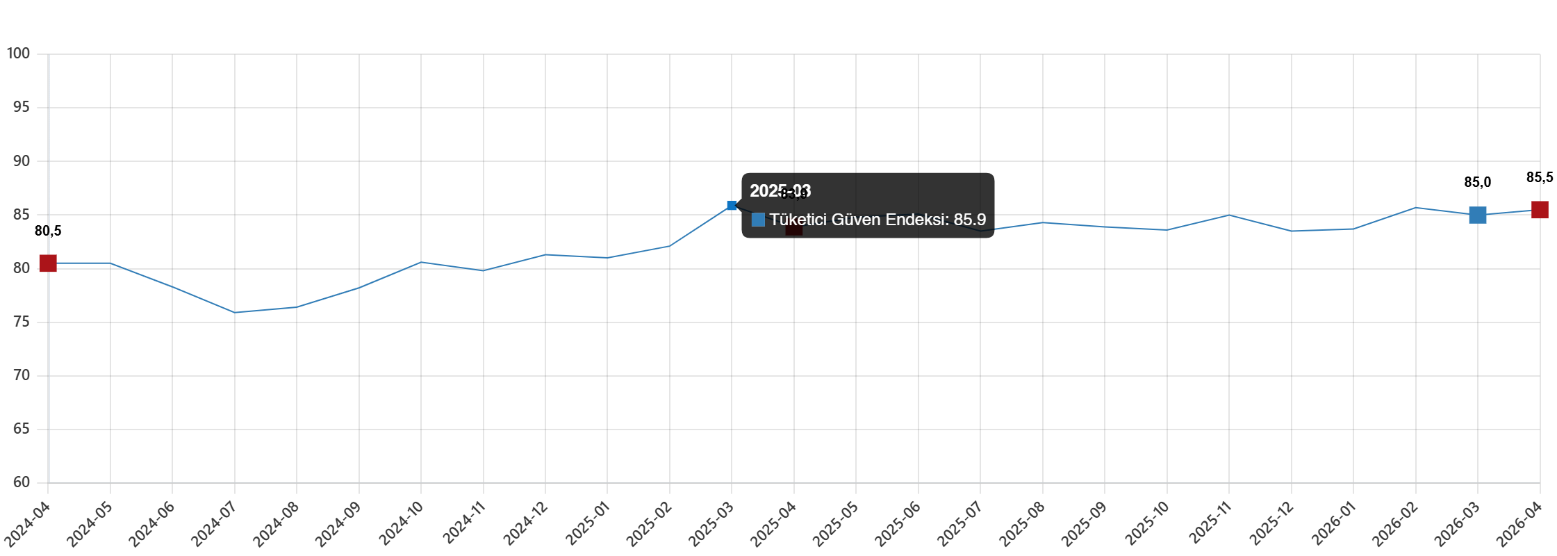 Tüketici güven endeksi 0 ile 200 arasında değer alırken, 100’ün üzerindeki değerler tüketici güveninde iyimserliği, 100’ün altındaki değerler ise kötümserliği gösteriyor. Nisan ayında endeks 85,5 olarak gerçekleşse de, tüketicilerin genel görünümde temkinli duruşunu koruduğu görüldü.