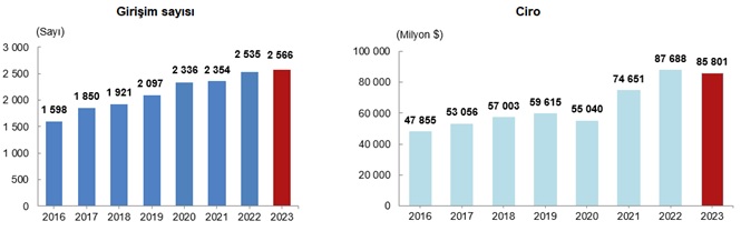 TÜİK'in açıkladığı yurt dışında kontrol edilen girişim istatistiklerine göre, Türkiye'de yerleşik girişimlerin yurt dışında kontrol ettiği girişim sayısı 2022 yılında 2 bin 535 ve 2023 yılında 2 bin 566 oldu. Bu girişimler 2022 yılında 87 milyar 688 milyon dolar, 2023 yılında ise 85 milyar 801 milyon dolar ciro elde etti.