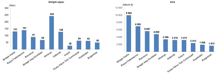 Rusya, yurt dışında kontrol edilen girişim sayısı açısından 141, elde edilen ciro açısından da 6 milyar 953 milyon dolar ile ikinci sırada yer aldı. Ciroda 5 milyar 657 milyon dolar ile üçüncü sırayı alan Romanya'da kontrol edilen girişim sayısı 91 olarak gerçekleşti.