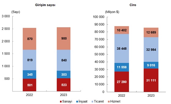 Yurt dışında kontrol edilen girişimlerde en yüksek ciro ticaret faaliyetinde oluştuYurt dışında kontrol edilen girişimlerin 2023 yılında faaliyete göre oluşan ciro toplamında ilk sırada ticaret; sonra sırasıyla sanayi, hizmet ve inşaat faaliyetleri yer aldı. Yurt dışında ticaret faaliyeti gösteren girişimler toplam 32 milyar 984 milyon dolar ciro elde etti. Ciro toplamında ikinci sırada yer alan sanayi faaliyetinde 31 milyar 111 milyon dolar, üçüncü sıradaki hizmet faaliyetinde 12 milyar 689 milyon dolar ve son sıradaki inşaat faaliyetinde ise 9 milyar 16 milyon dolar ciro elde edildi. Yurt dışında kontrol edilen girişimlerin 900'ü hizmet, 840'ı ticaret, 523'ü sanayi ve 303'ü ise inşaat sektöründe faaliyet gösterdi.
